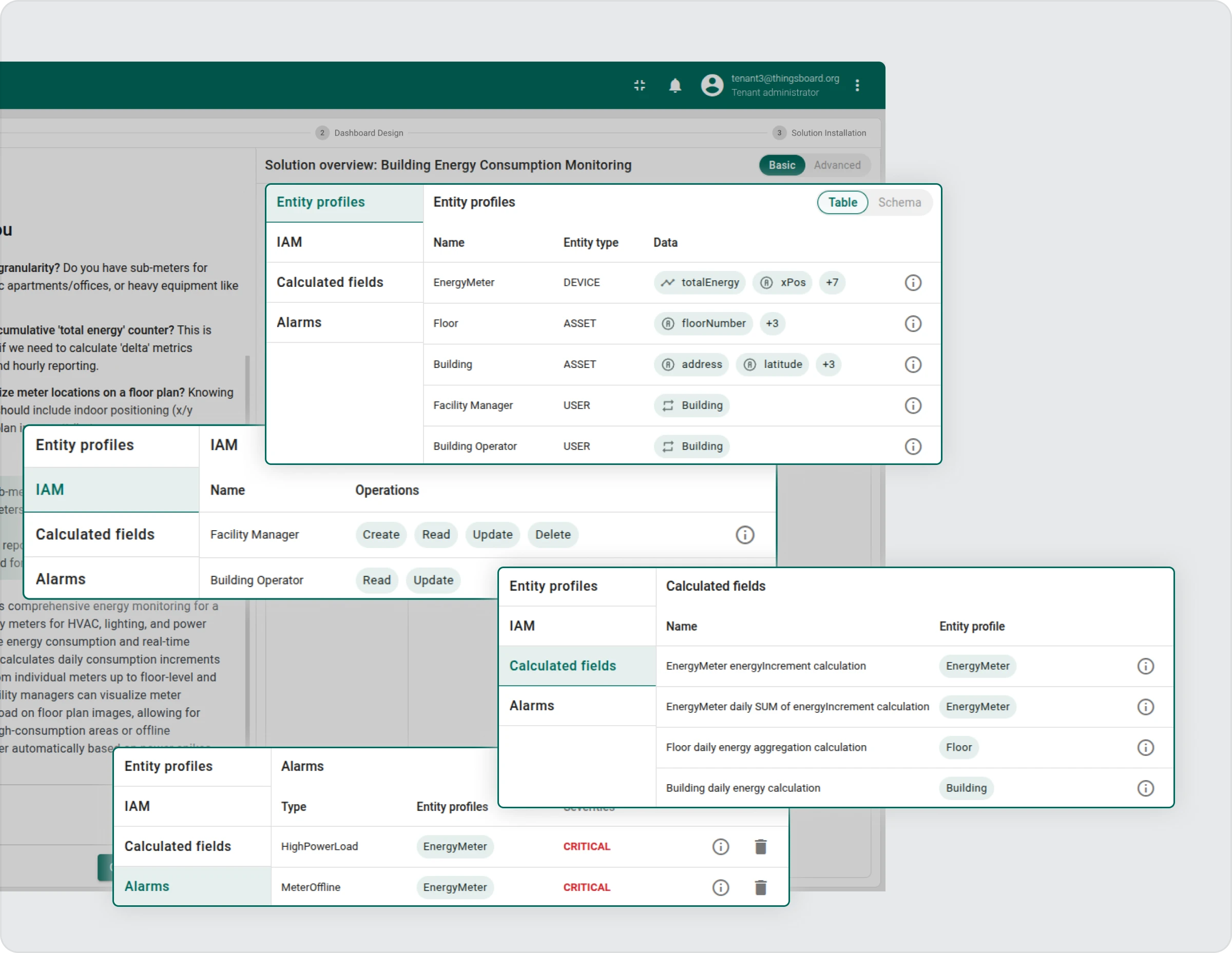 Step 1 — Architecture Design. Tell the AI Agent what you’re building. It will ask clarifying questions if needed, or jump straight to a proposed solution if your description is clear enough. The proposal breaks down into four sections: Entity Profiles, IAM (user roles and permissions), Calculated Fields, and Alarm Rules. You can review the full entity hierarchy in a visual schema view, request adjustments in plain language, and move on when you’re satisfied.
