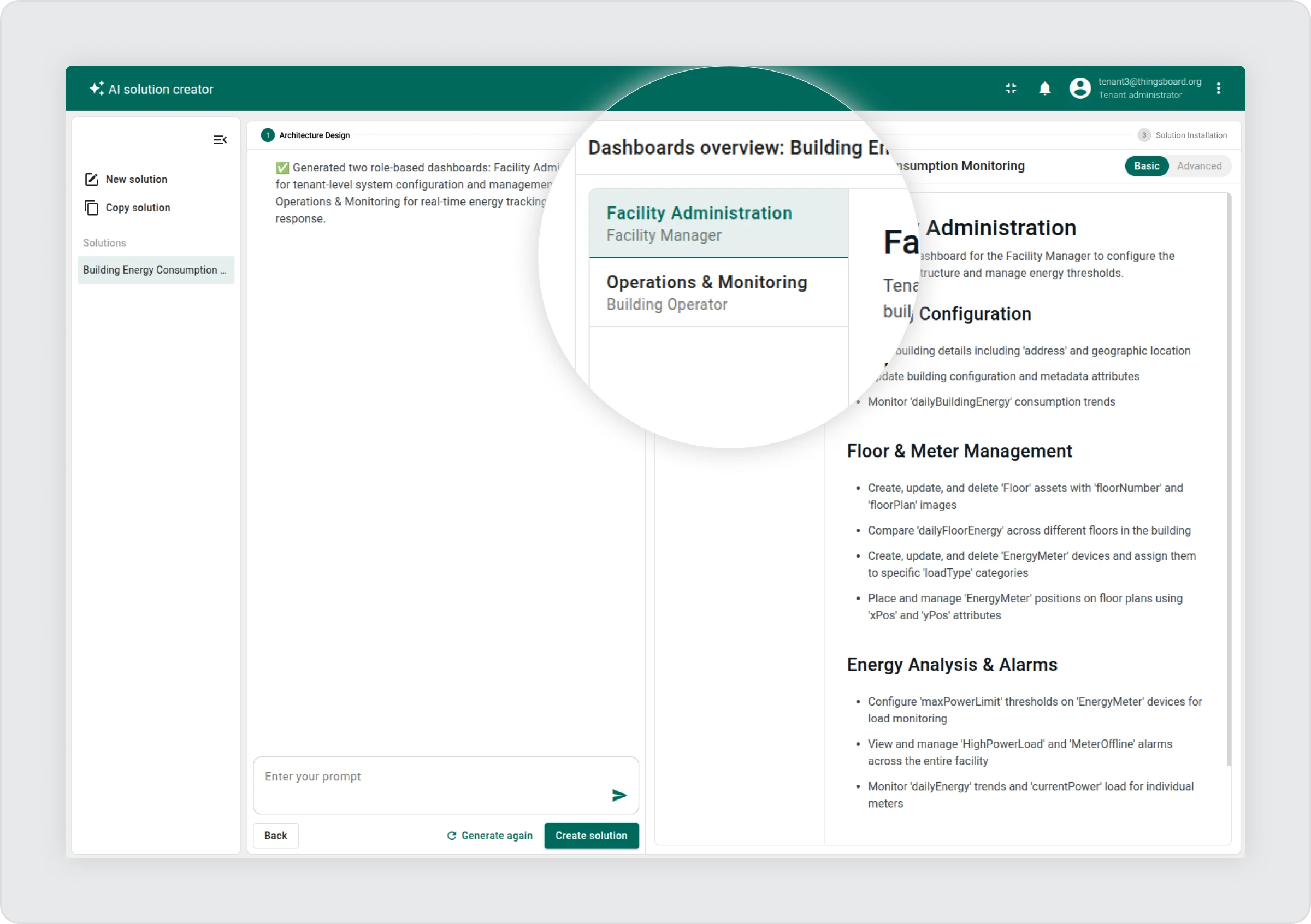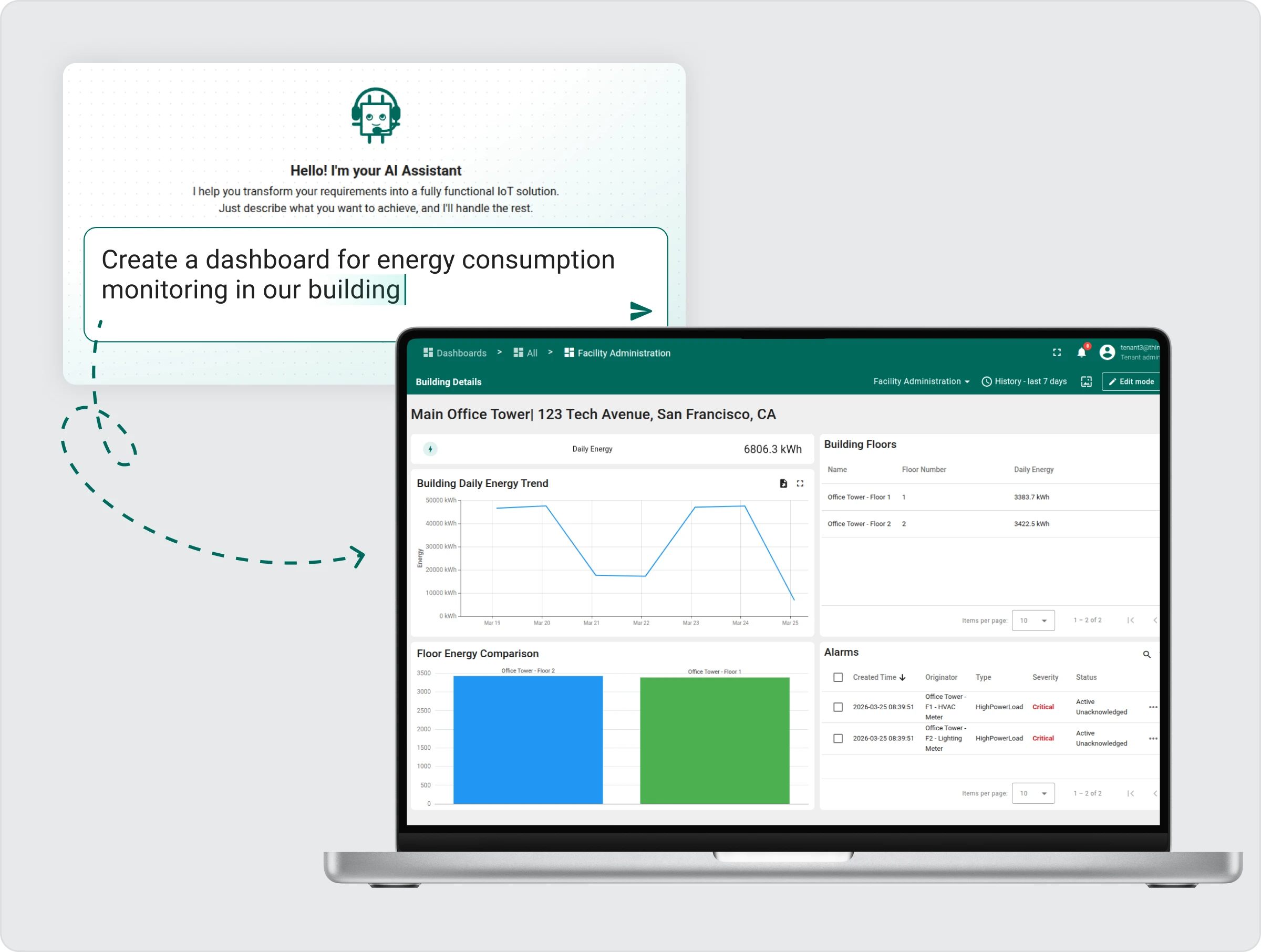 You don’t need to be a ThingsBoard expert to start. Describe your requirements and watch the platform configure itself. The best way to learn is by exploring a working system.