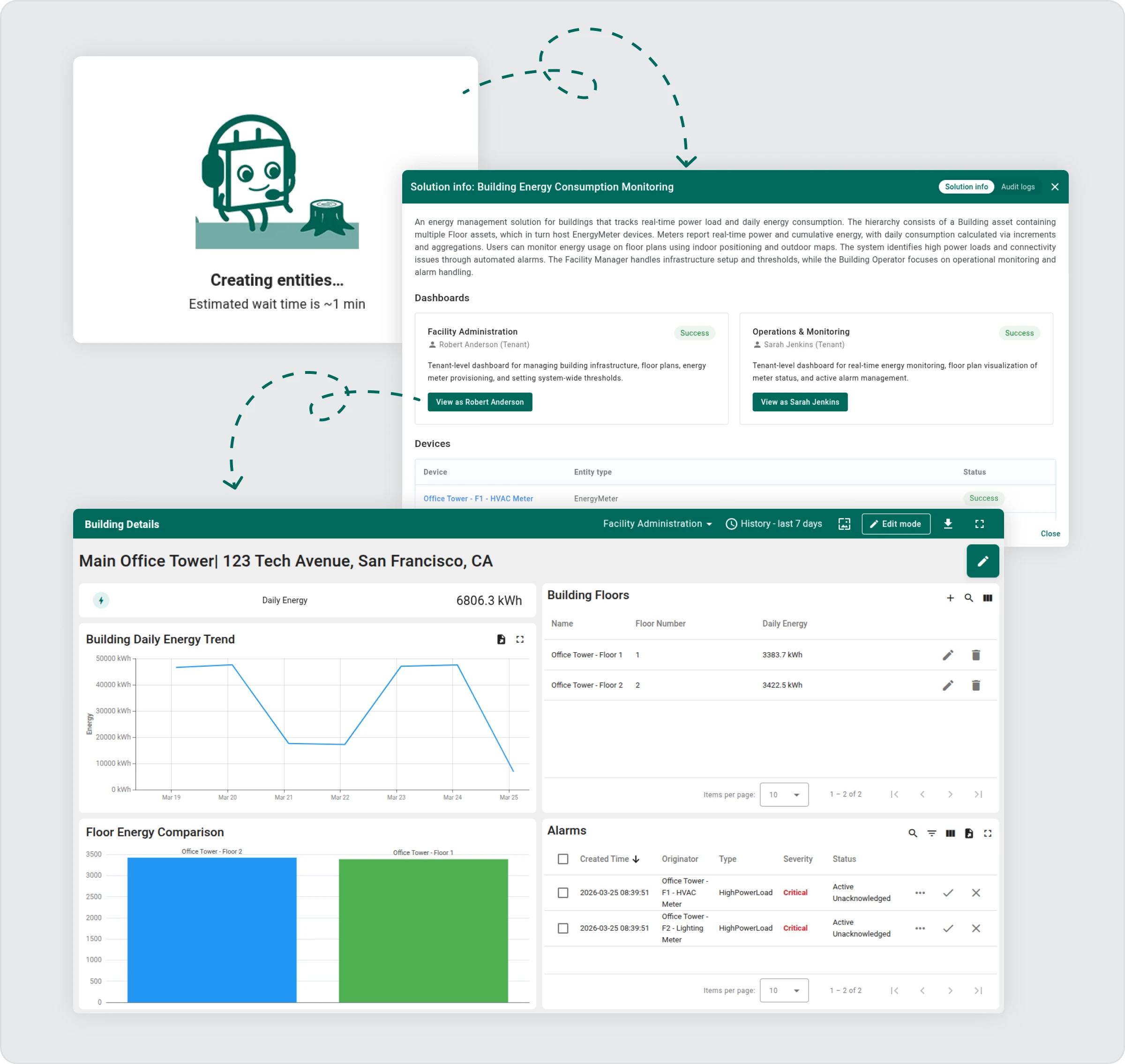 The result isn’t a generic template. It’s a foundational solution shaped around your specific needs, ready to fill with real data from your devices. AI Solution Creator is the ability to work with ThingsBoard solution architects on your use case. This feature includes our experience and knowledge in building large, scalable IoT systems.