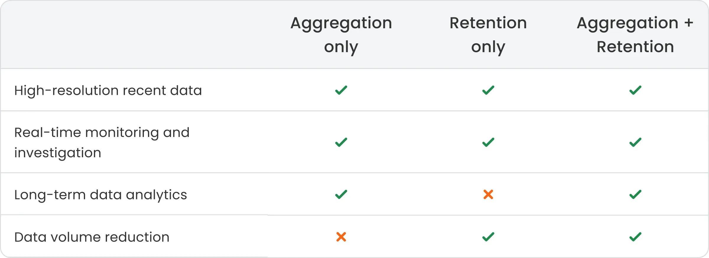 • Align aggregation with analysis needs: Select aggregation intervals that match how the data will be analyzed. Use hourly aggregation for operational trends and daily or monthly aggregation for long-term trend analysis.
