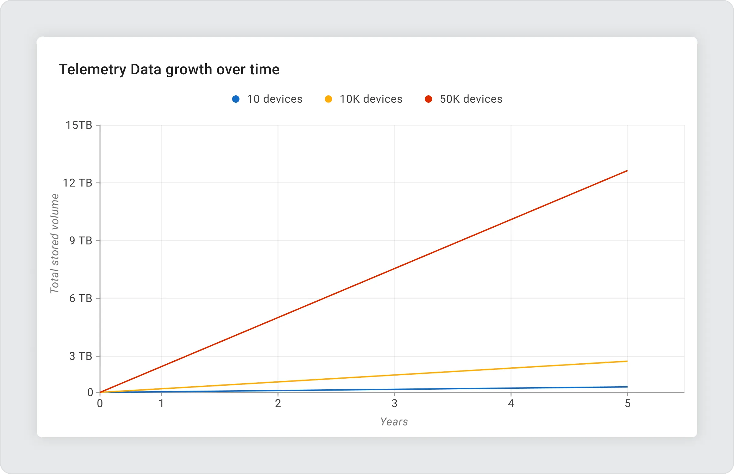 Aggregation dramatically reduces the number of stored data points. The following table shows the reduction in data points for 10,000 devices over a 5-year period: