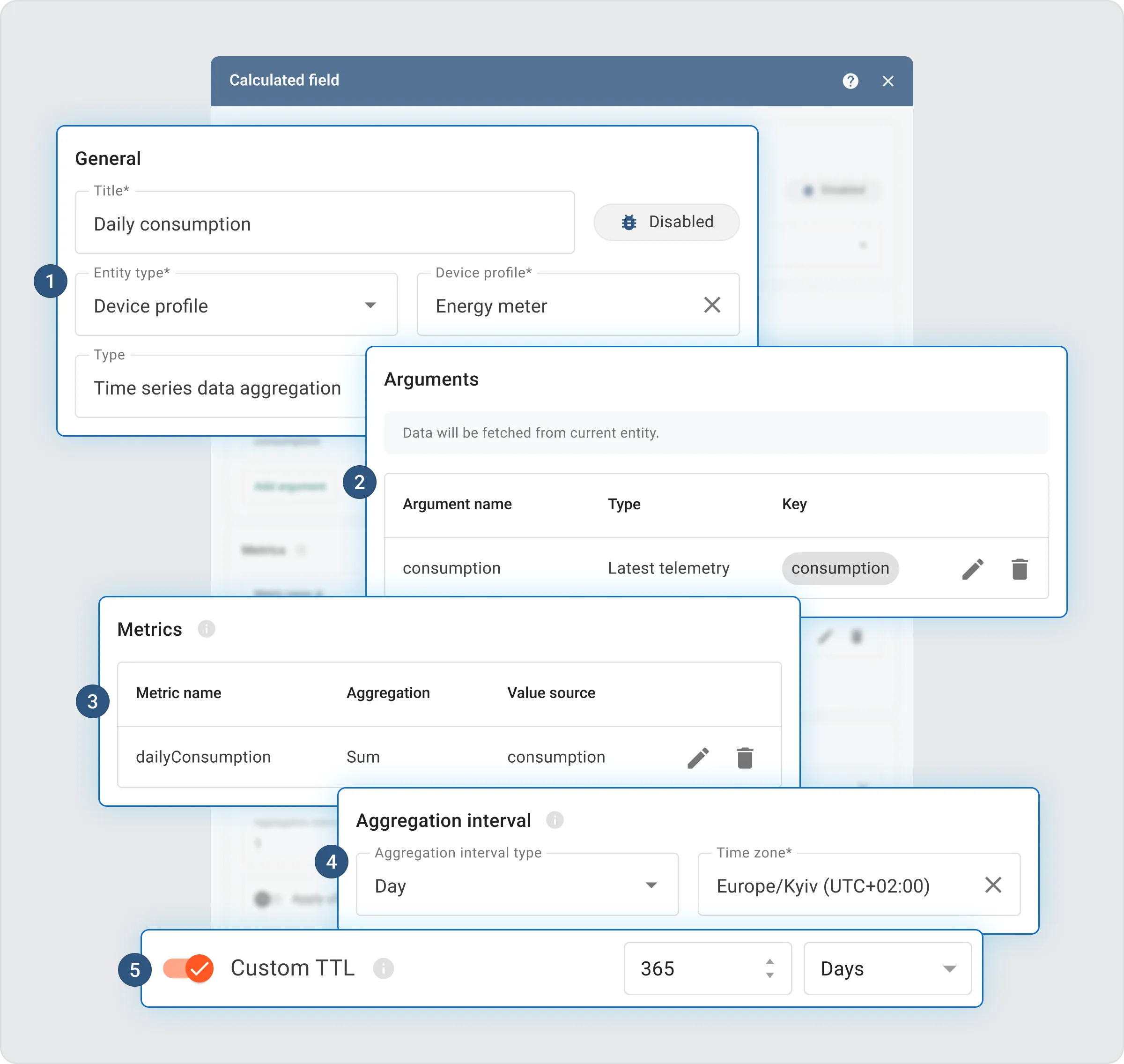 Aggregated data TTLs are set per calculated field (Step 1) and are independent of the raw telemetry TTL.