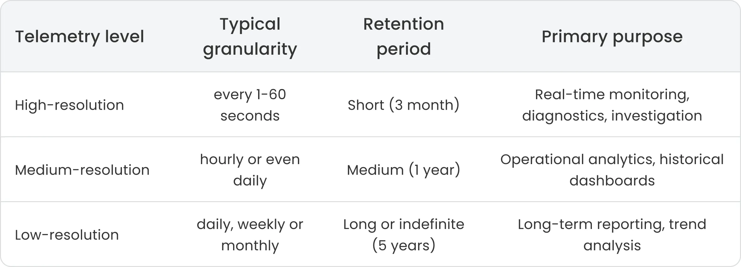 • Limit raw telemetry retention: Keep high-frequency raw data for diagnostics and investigation, but avoid retaining it longer than required for operational needs.