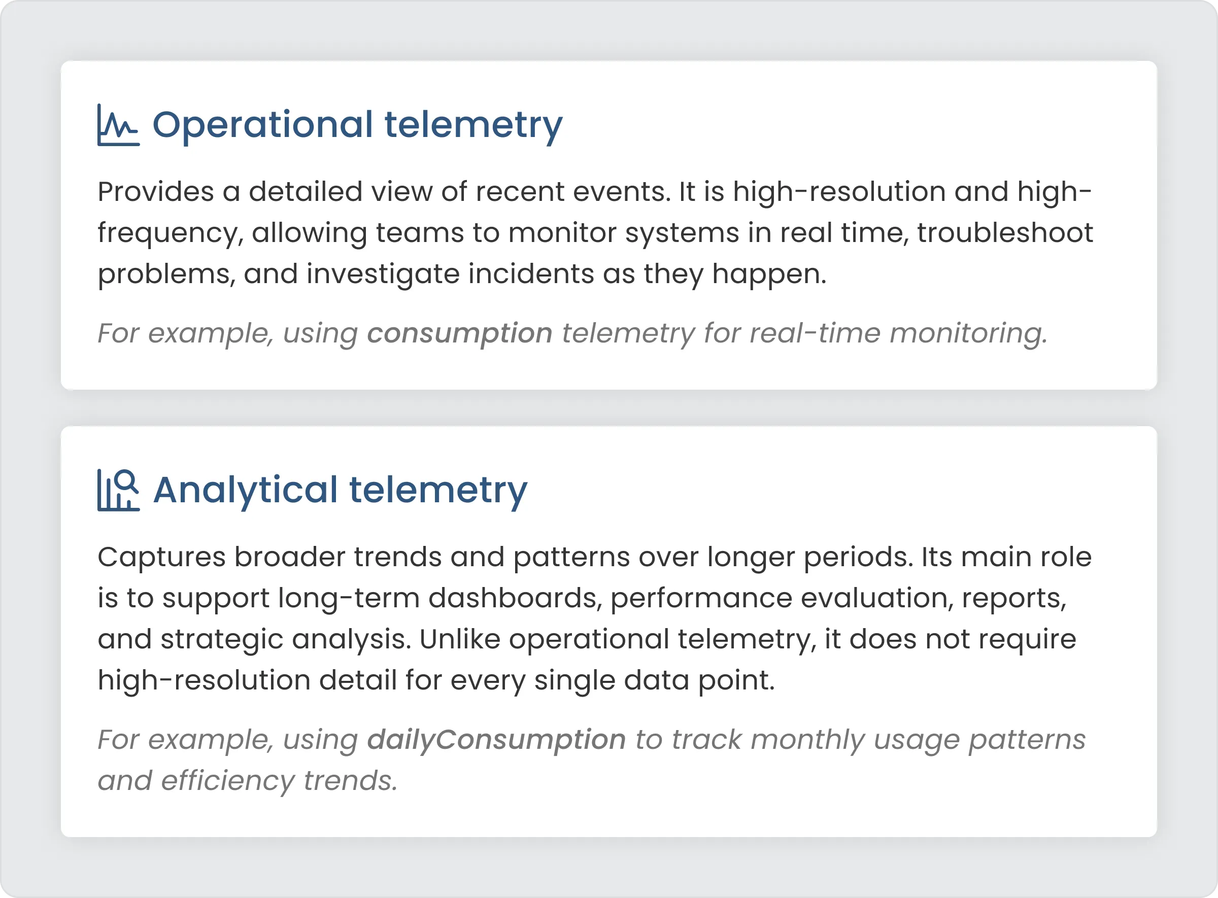 In practice, telemetry data serves two very different purposes. Understanding this distinction is key to designing an efficient storage strategy.