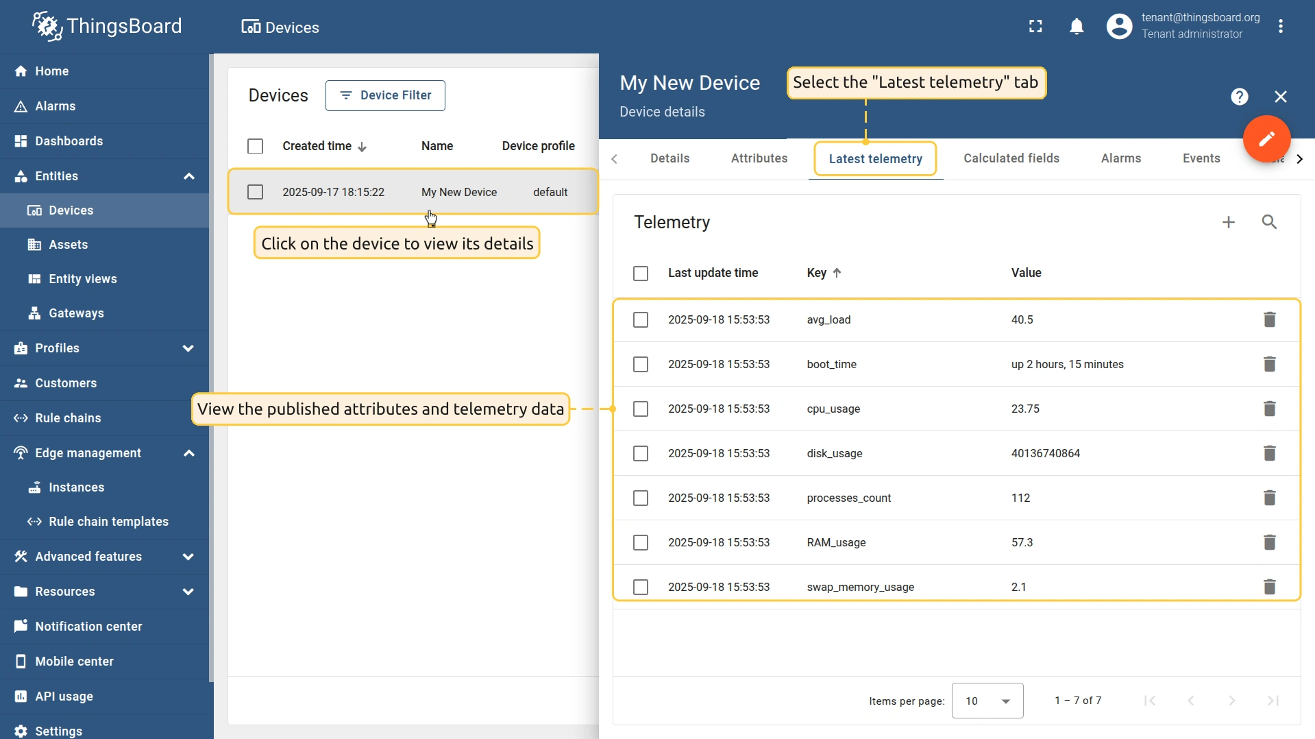 To go further, explore the ThingsBoard documentation to learn more about key features, such as creating dashboards to visualize your telemetry, or setting up alarm rules to monitor device behavior in real time.