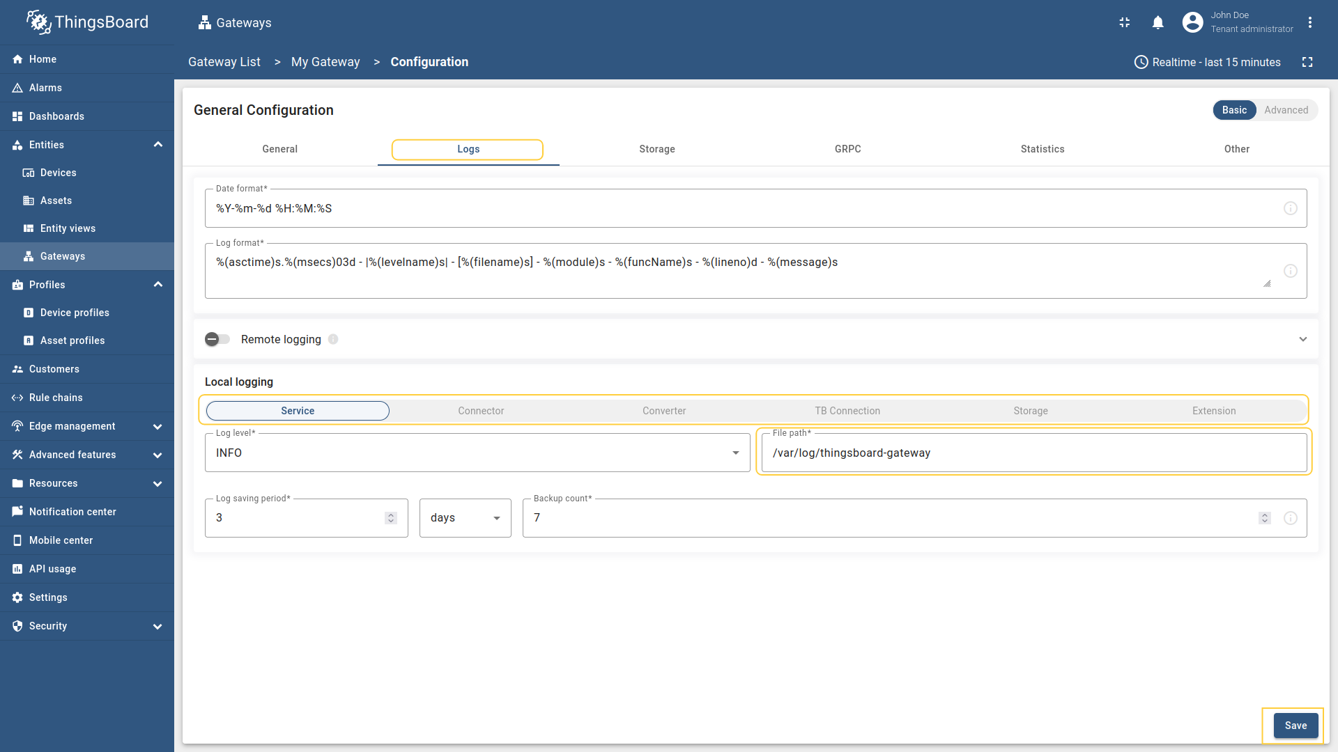 Navigate to the “Logs” tab and replace the “File path” field value to /var/log/thingsboard-gateway in all tabs. Then, click “Save”.