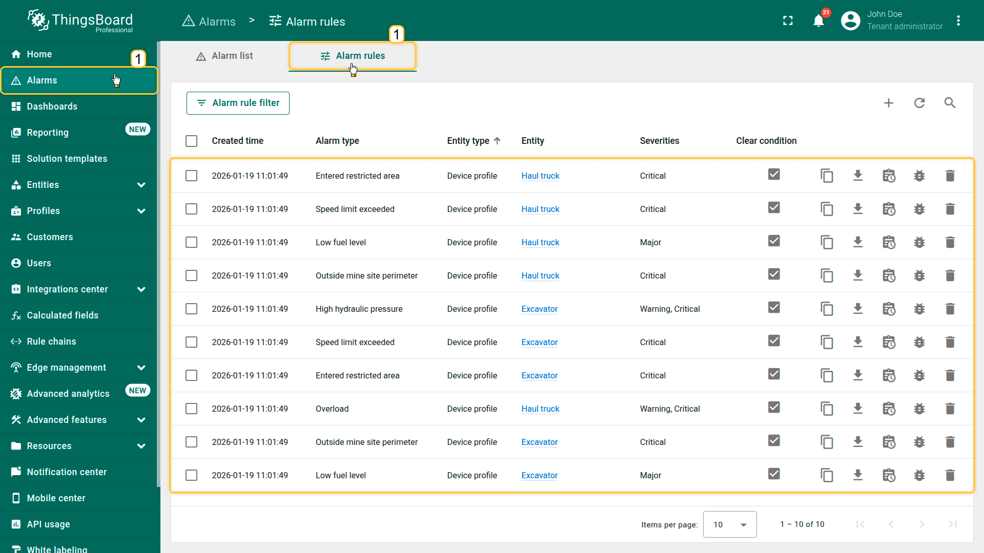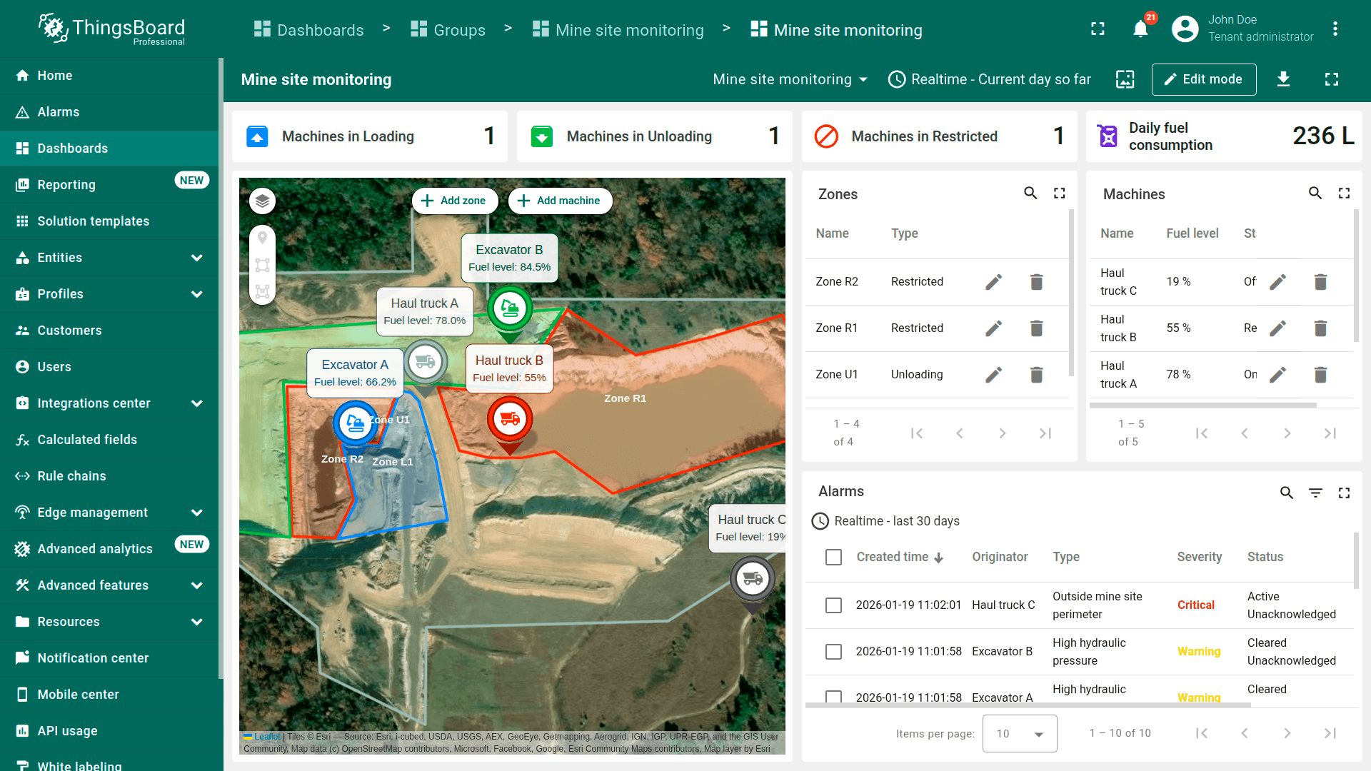 - Device profiles and logic - Dedicated device profiles are provided for excavators and haul trucks and include calculated fields for geofencing, derived telemetry, and data aggregation, as well as preconfigured alarm rules for safety and operational conditions.