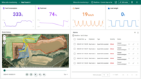 - Main state – Provides an overview of the entire site, including live machine positions on the map, KPI cards for machines in Loading, Unloading, and Restricted zones, and daily fuel consumption.