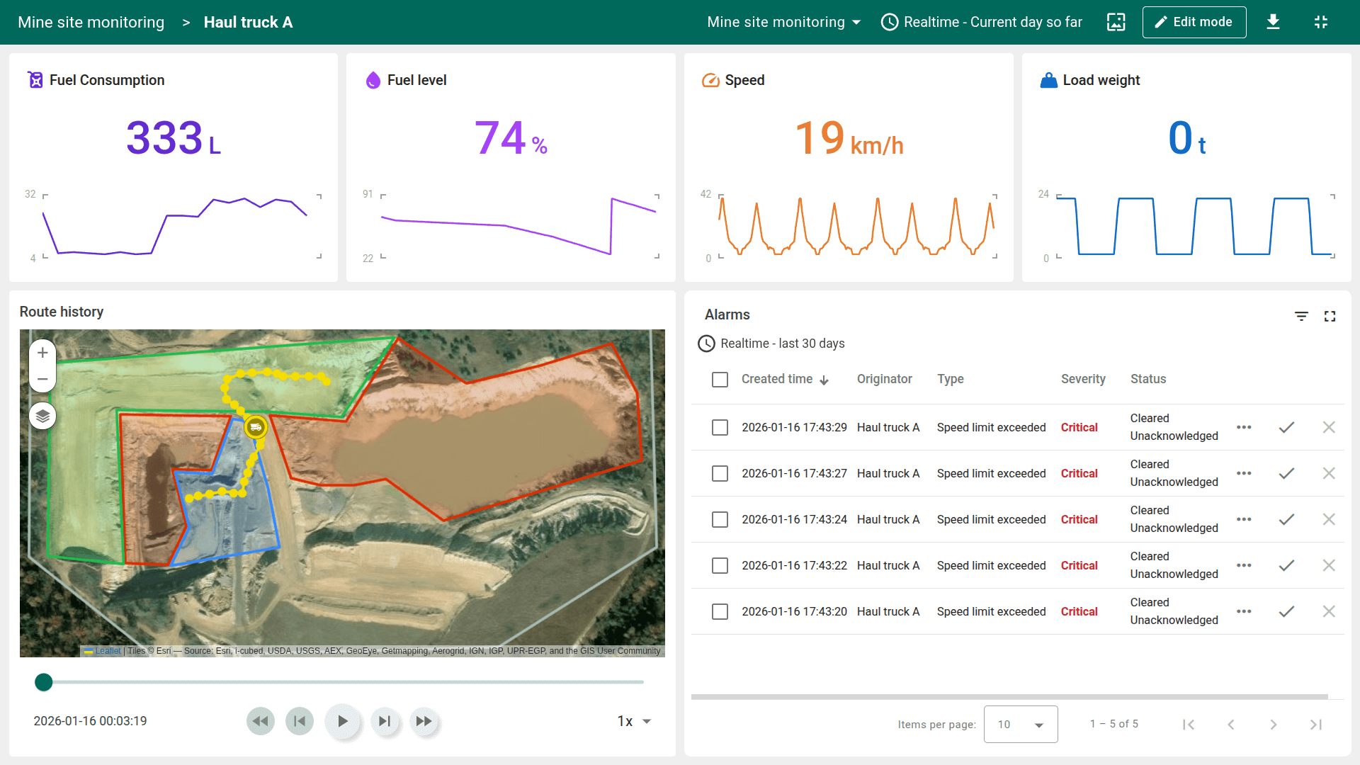 The Site fleet tracking solution template delivers a complete digital twin for heavy-industry fleet monitoring. By combining real-time location tracking, geofencing, calculated metrics, and alarm-driven safety logic, the solution enables operators to monitor site activity, improve safety, and optimize fleet utilization from a single dashboard.