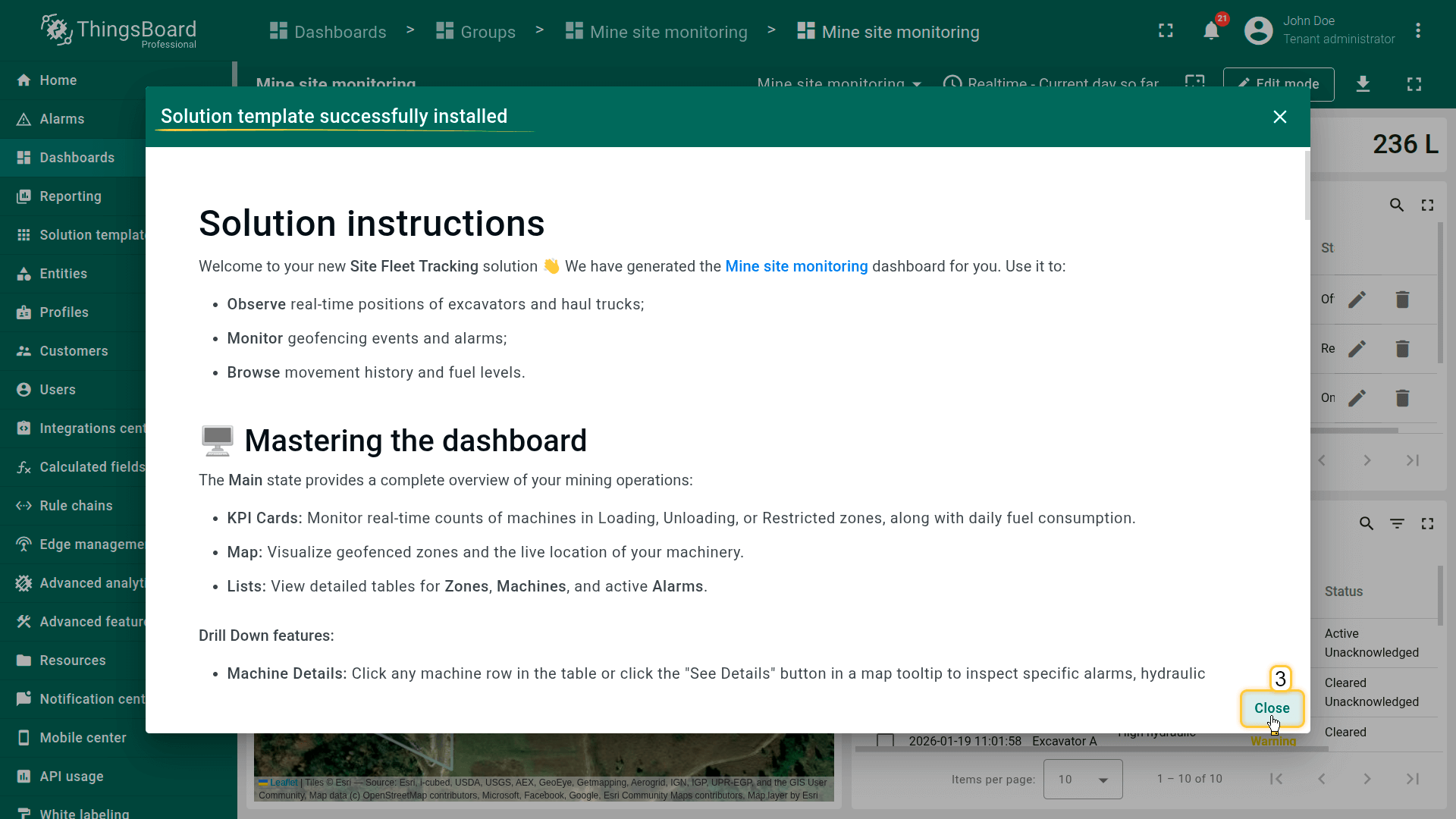 The Site fleet tracking solution template provides a ready-to-use mine site monitoring and fleet tracking application. After installation, it deploys a fully functional digital twin with geofenced zones, real-time machinery tracking, calculated fields, and pre-configured alarms for safety and operational monitoring.