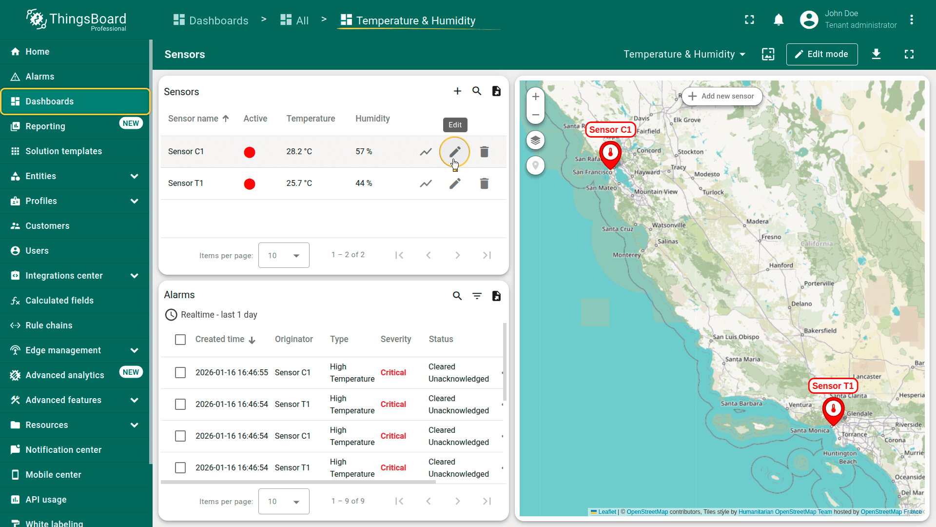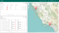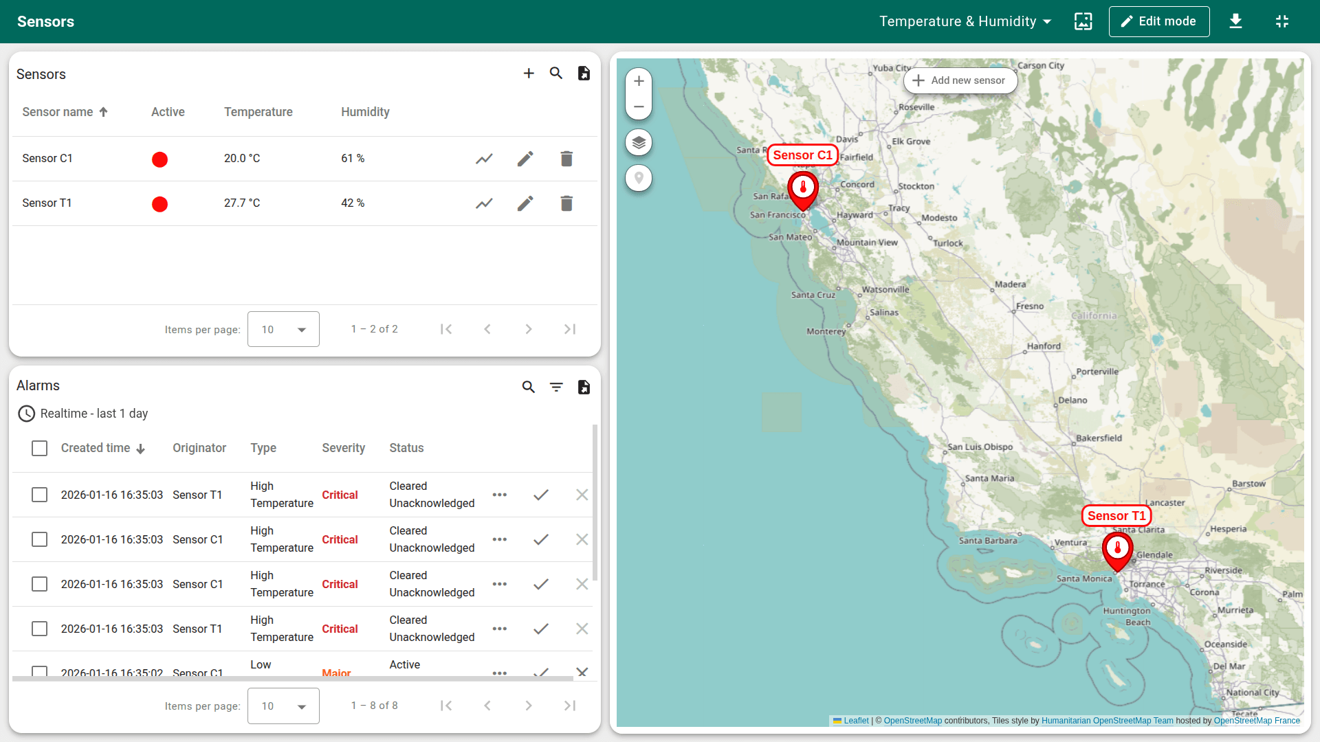 • Dashboard. The Temperature & Humidity dashboard provides real-time visualization of sensor telemetry, alarm management, sensor configuration, and an interactive map with device locations.
