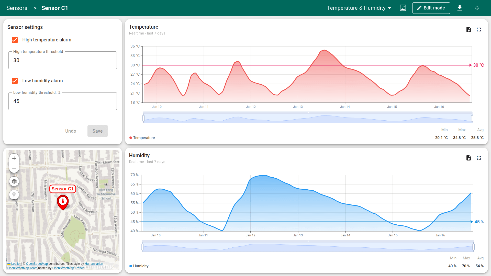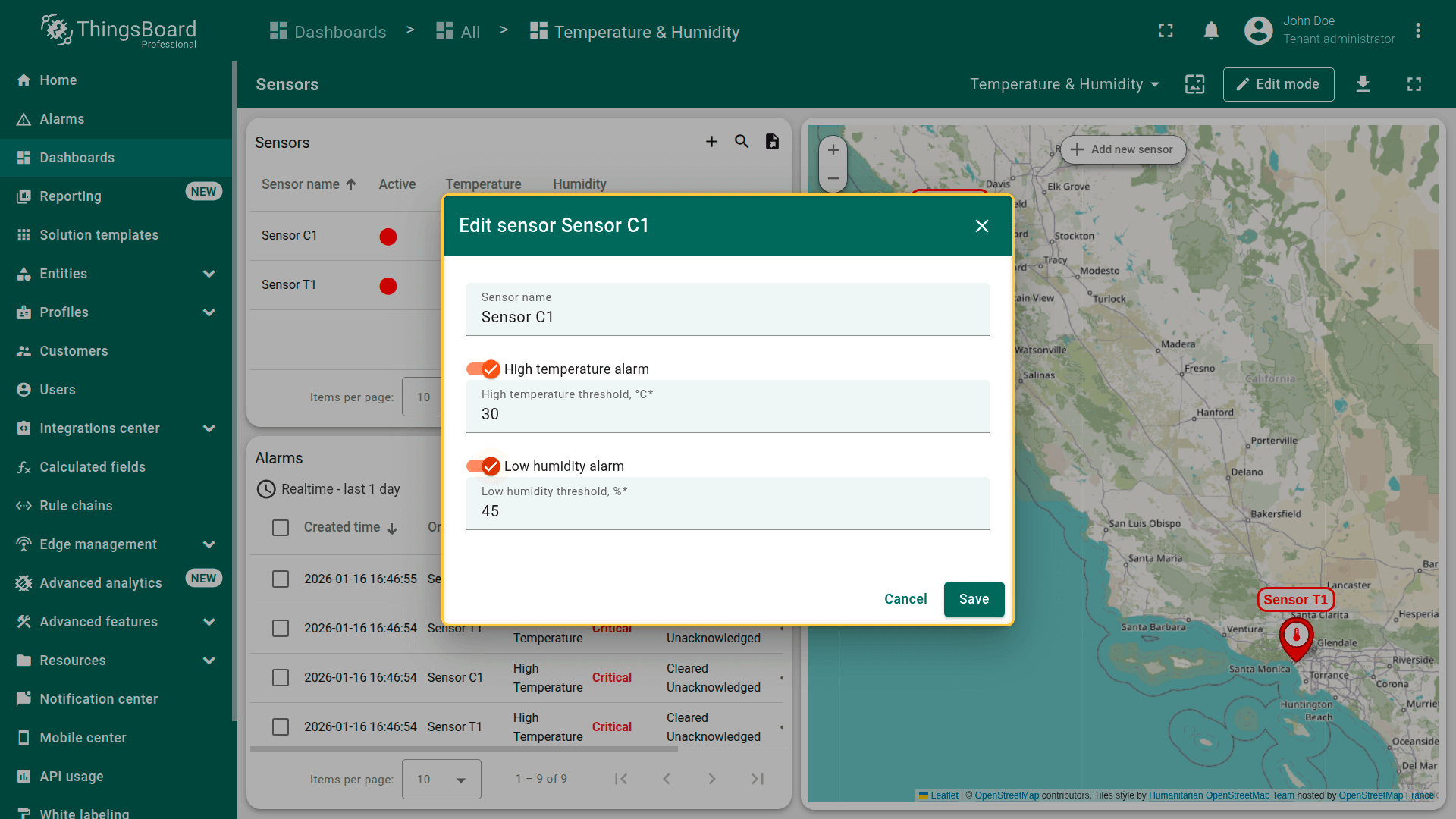 Alarm thresholds and enable/disable state can be modified directly from the dashboard using the Edit Sensor action.