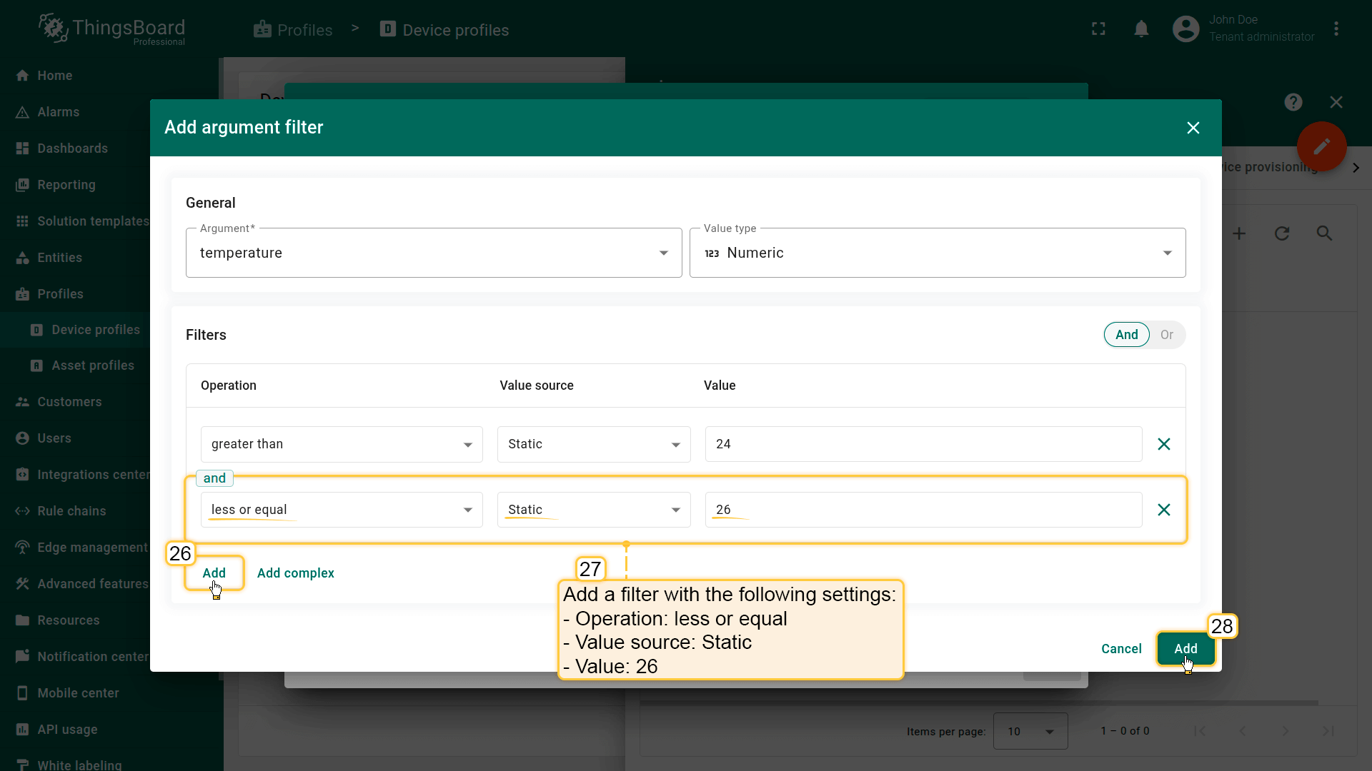 Filters: Click Add new filter (15): Operation (16): greater than; Value source: Static; Value: 26.