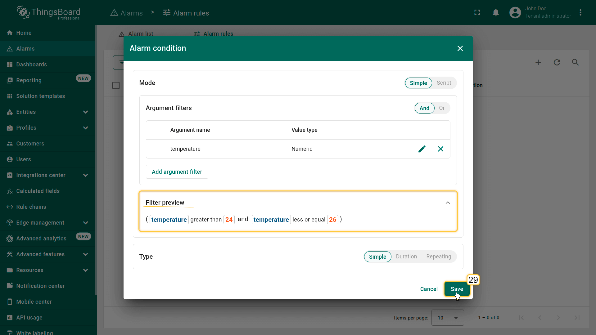 – An alarm with severity type “Critical” will be created if humidity drops below 35 %.