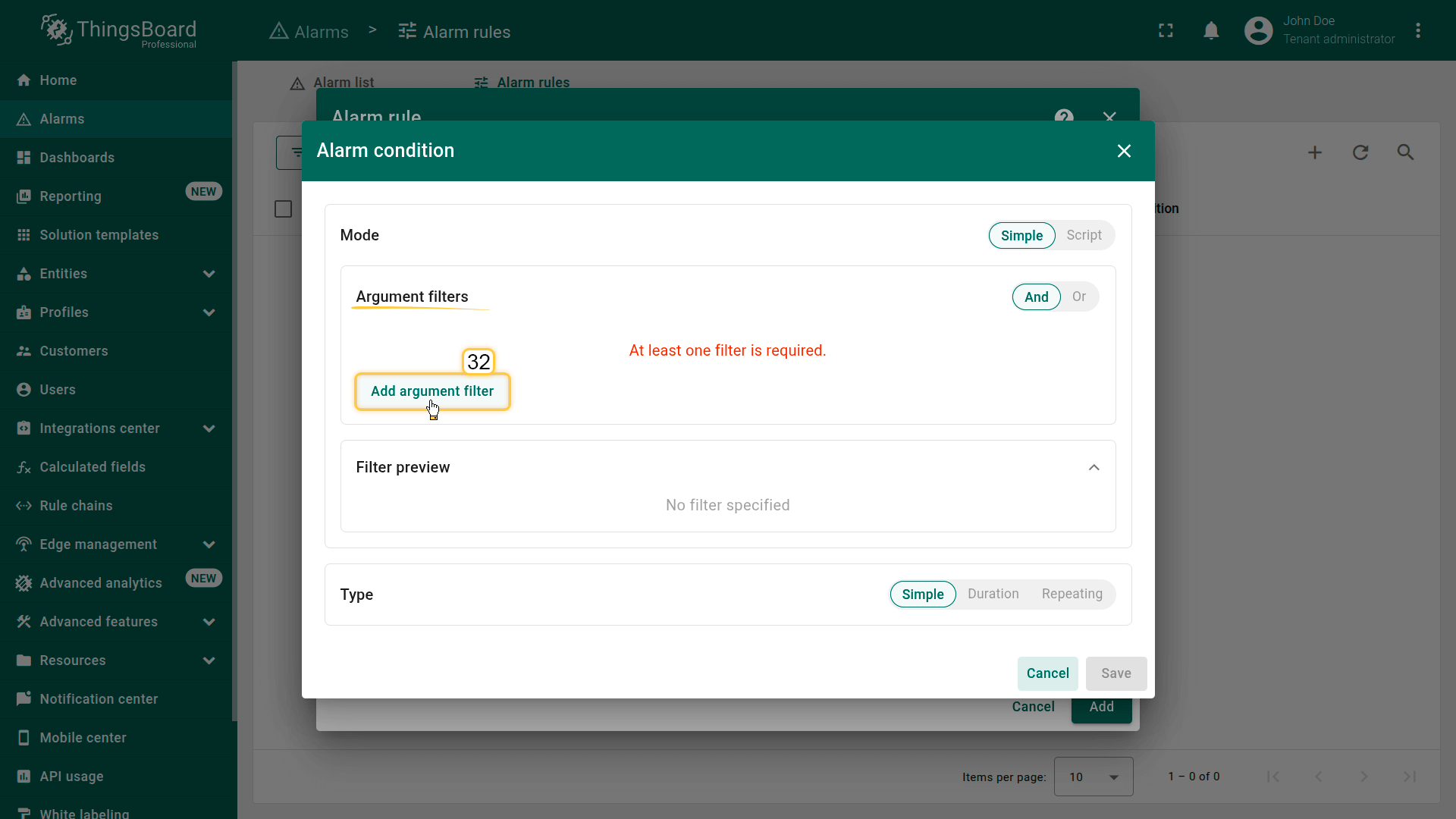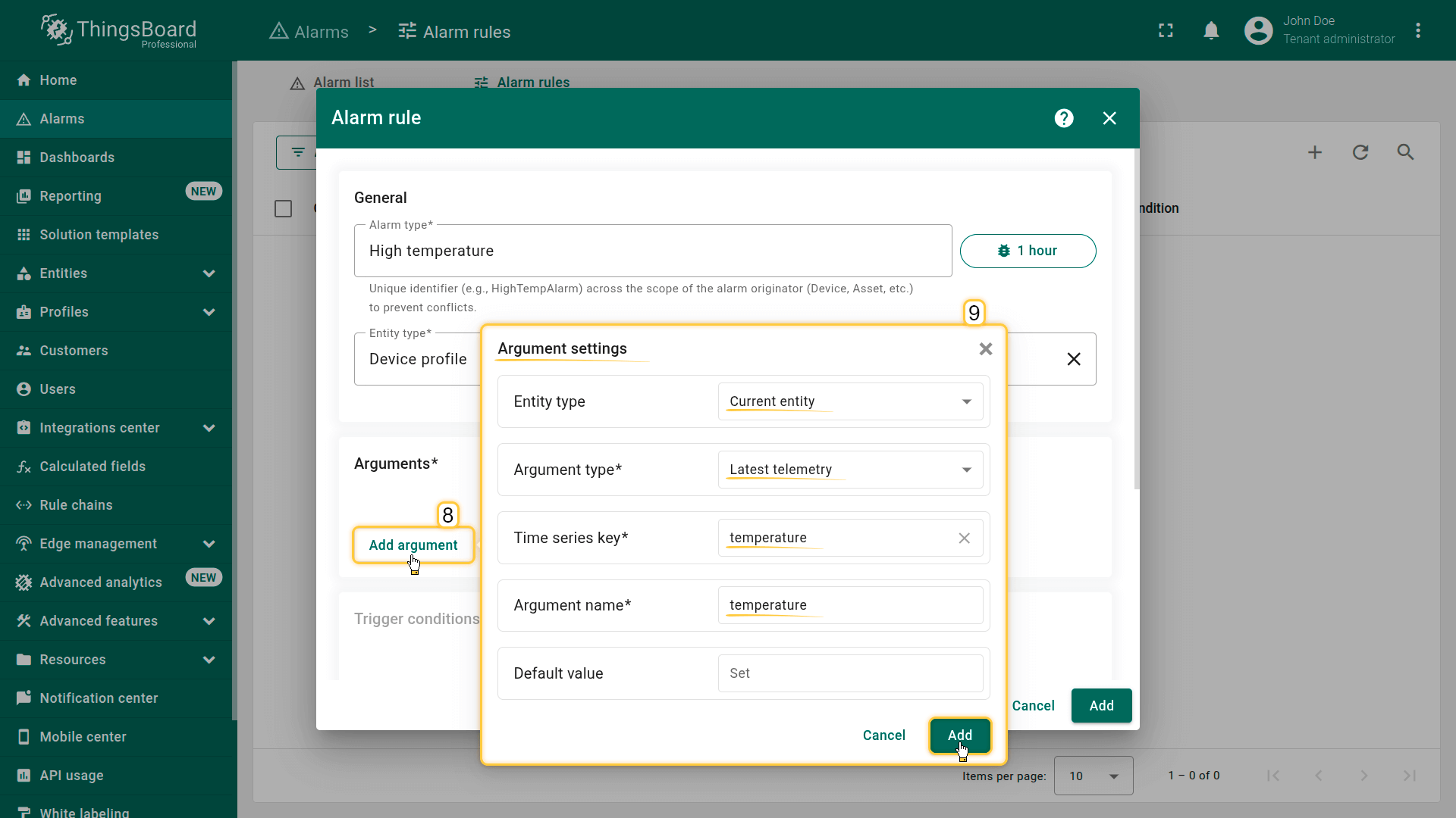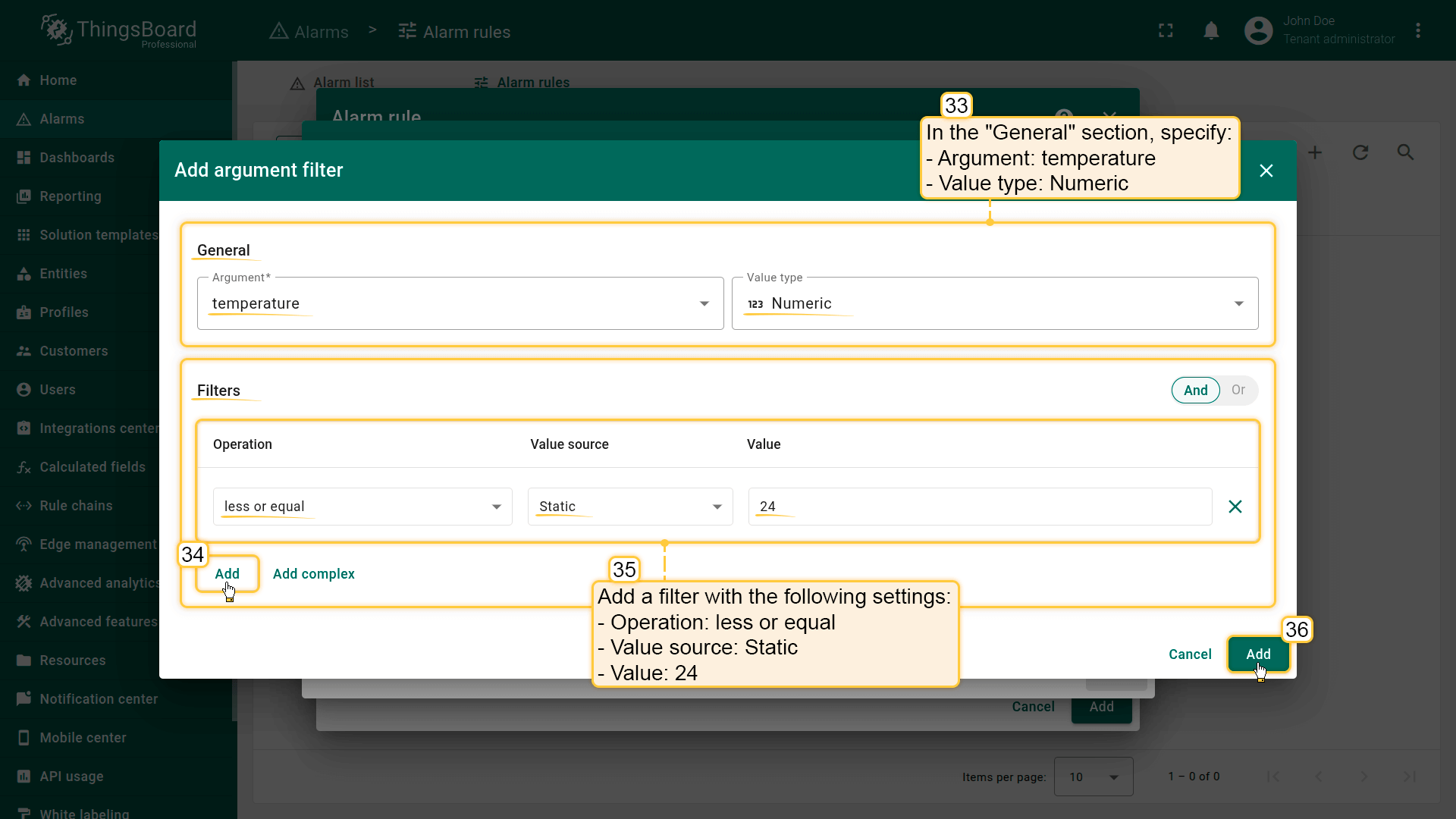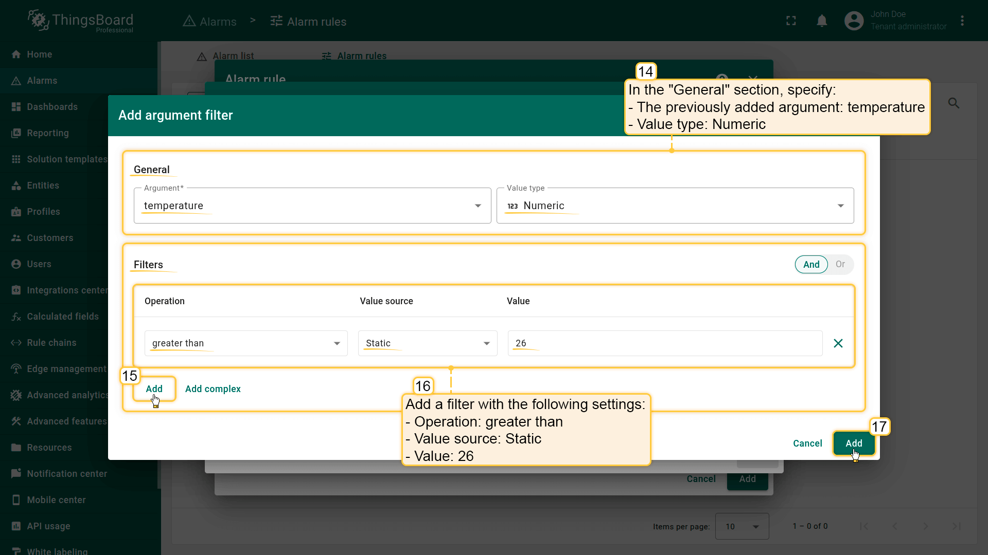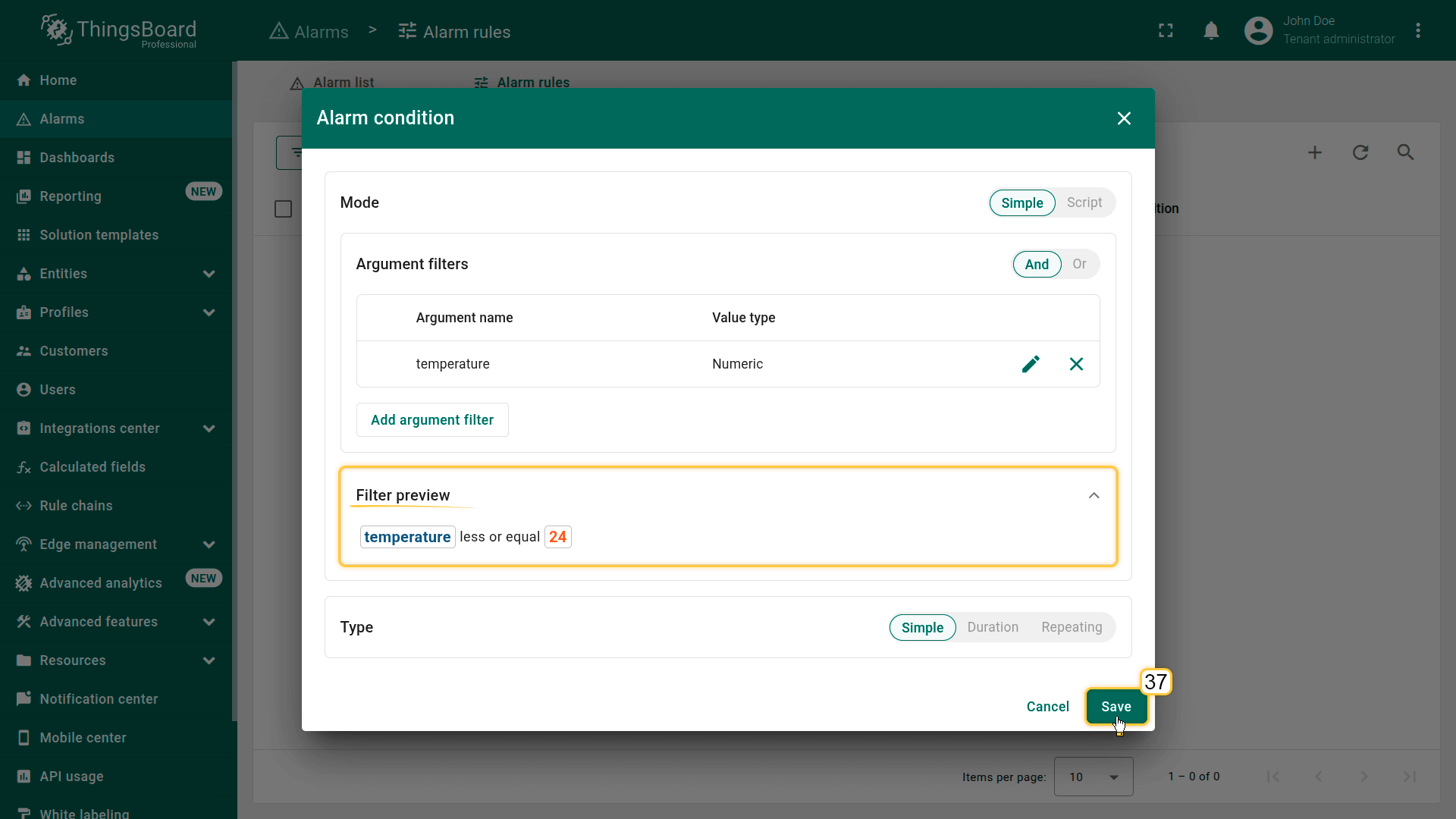 Configuring alarm rules for the Energy Meter and Water Flow Meter devices is slightly more complex. This is because the alarm must be triggered not by a single value, but by the hourly sum of telemetry values. To achieve this, we will use Calculated fields feature for additional calculations. Alarm rule configuration for these devices is covered in the next lessons.