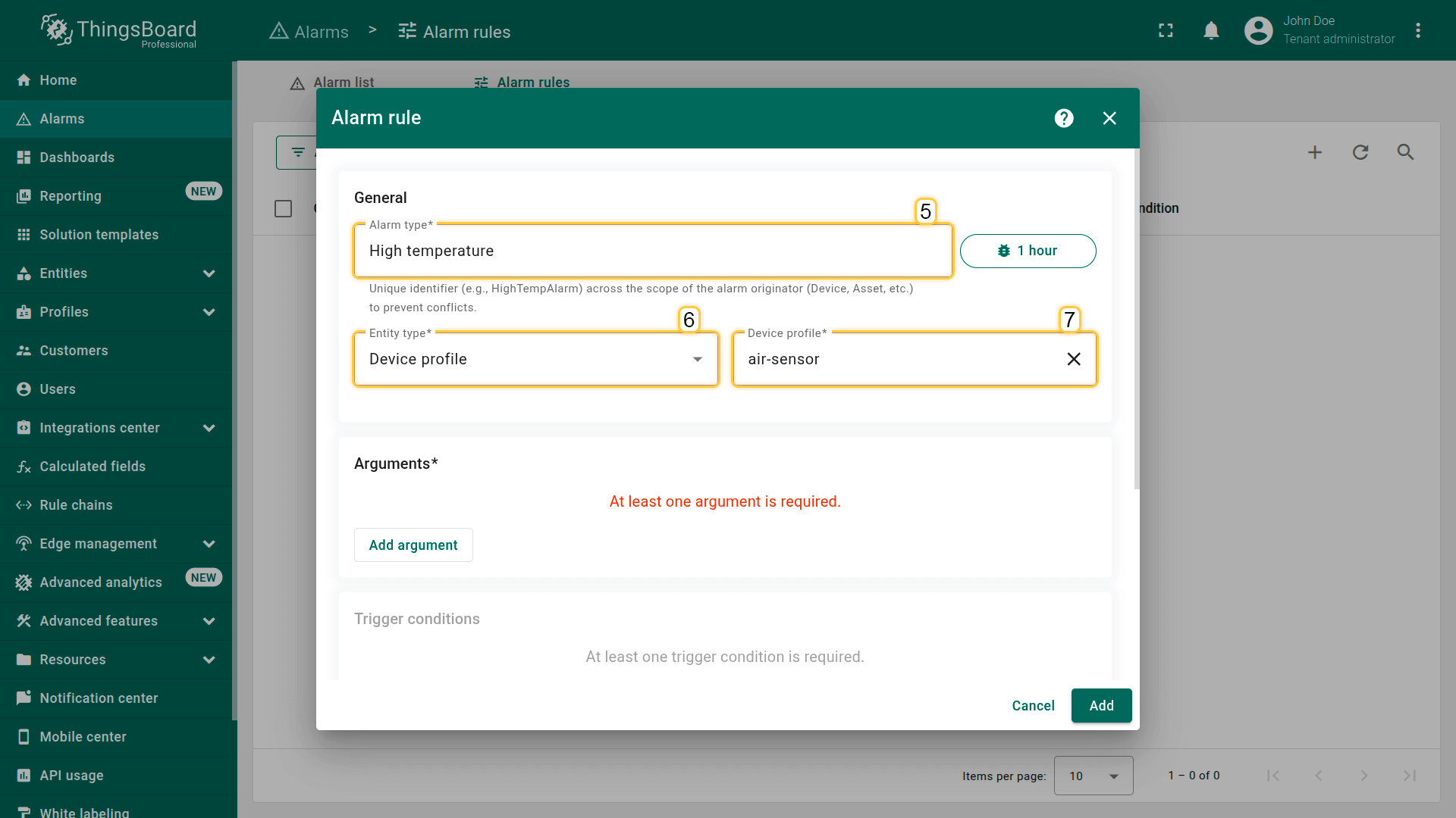Make sure to set the “air-sensor” device profile as the target entity of the alarm rule.