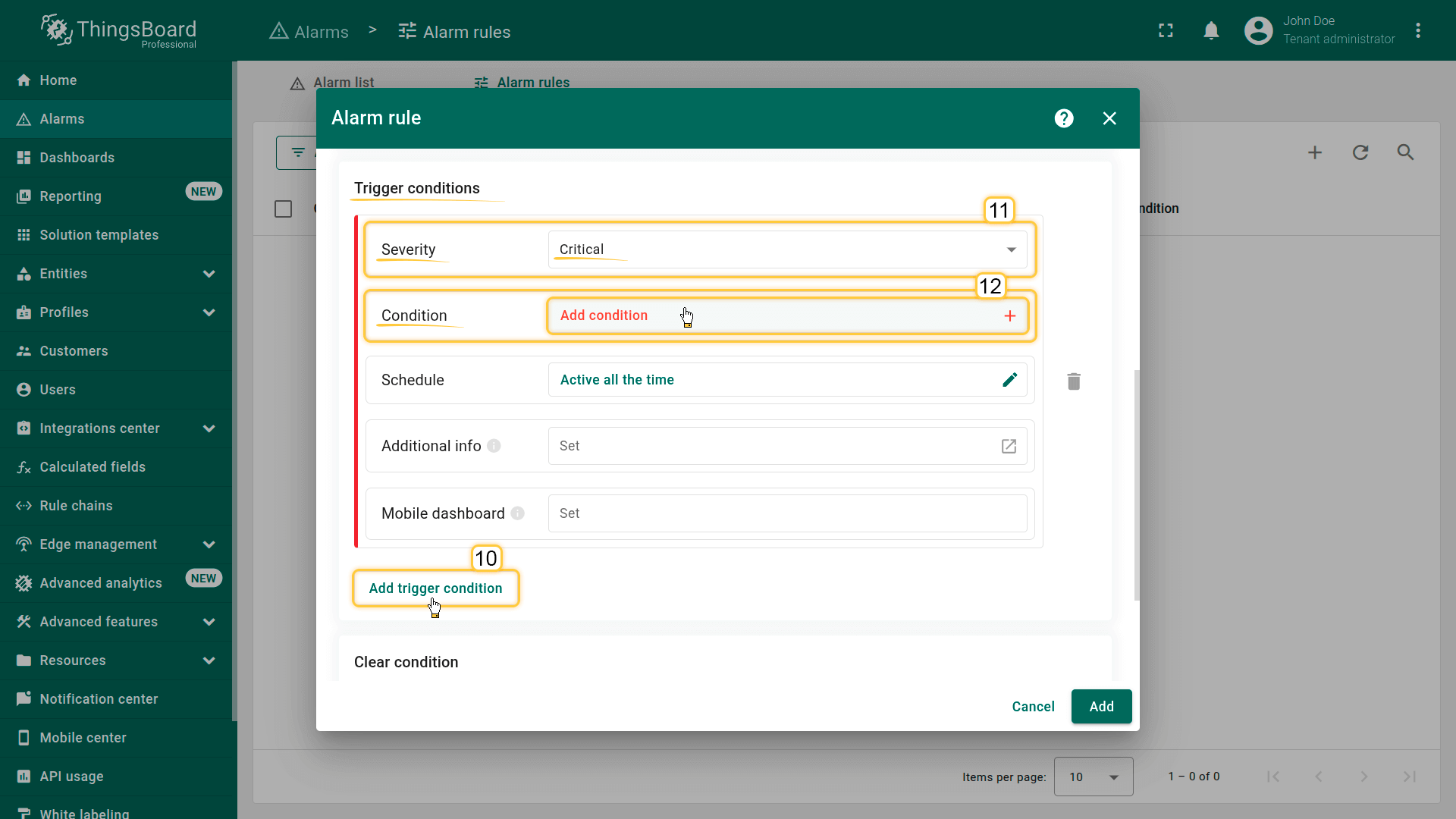 – An alarm with severity type “Critical” will be created if humidity exceeds 65 %.