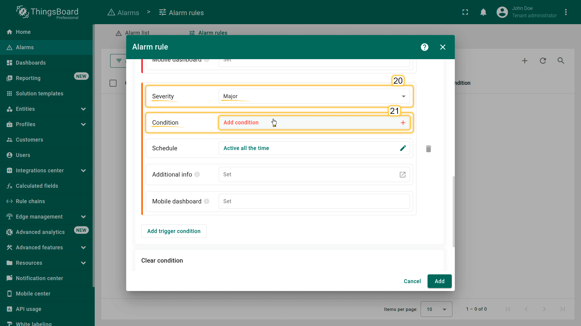 Add an alarm trigger condition with “Major” severity that is activated when the temperature is between 24 °C and 26 °C, inclusive.