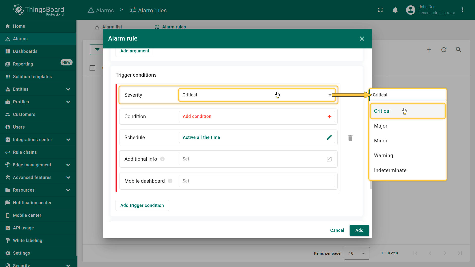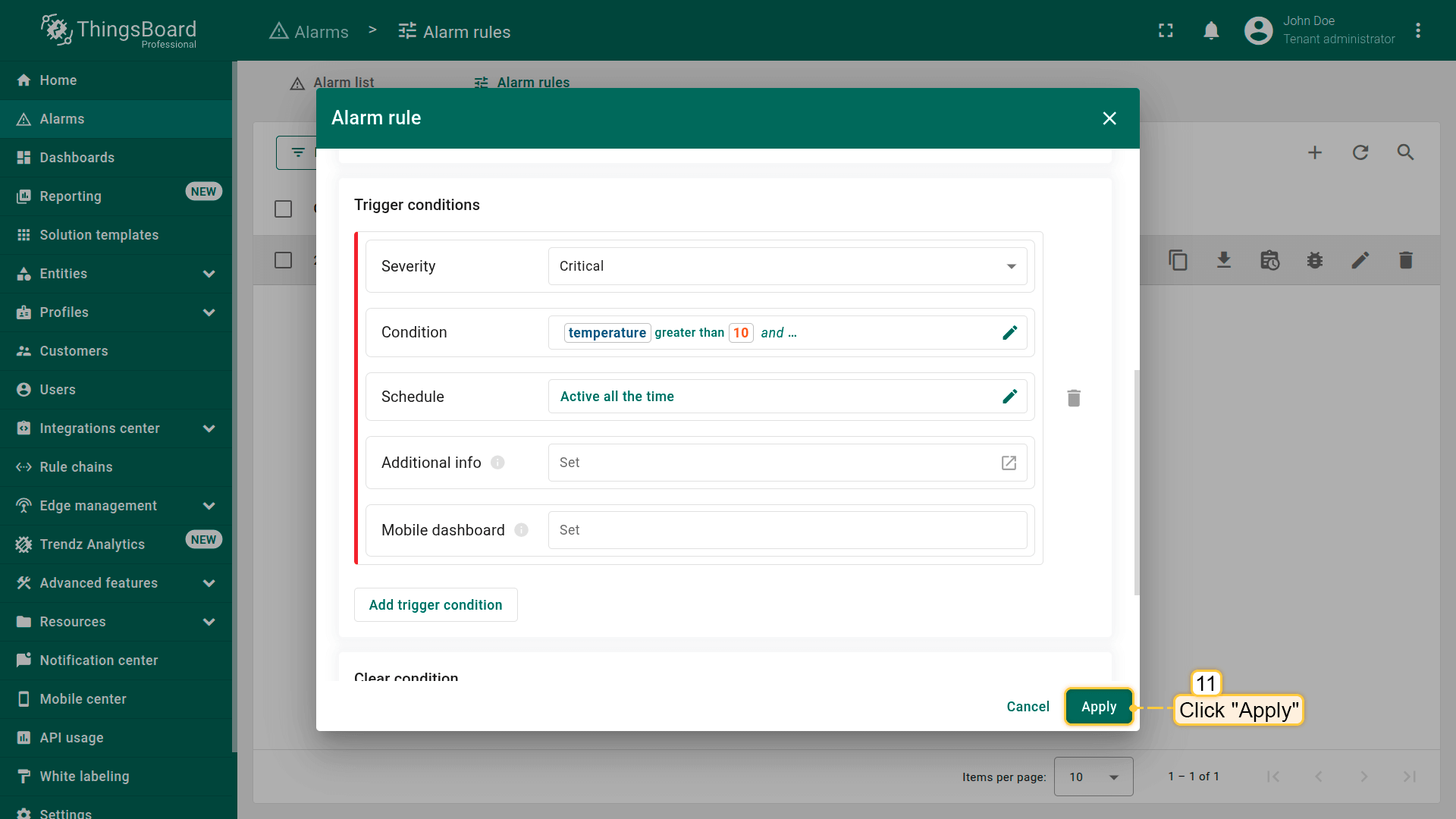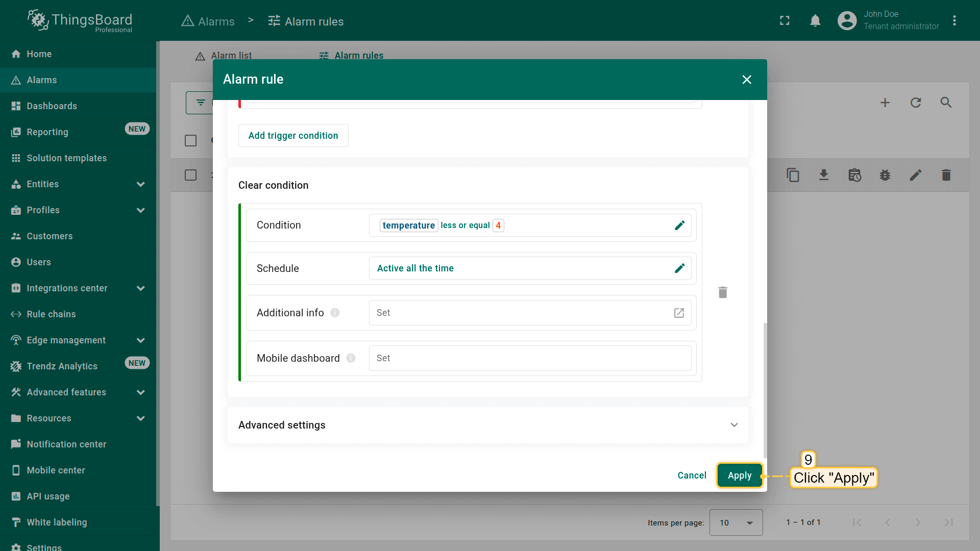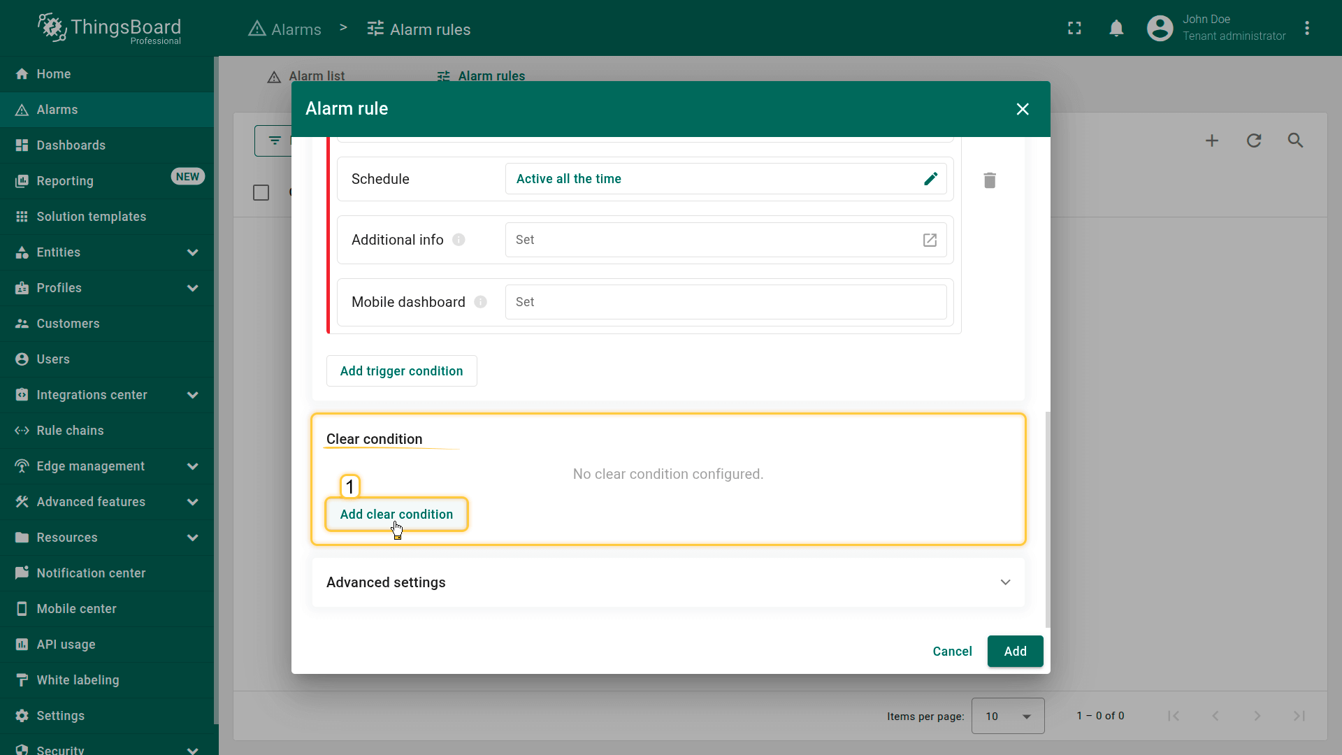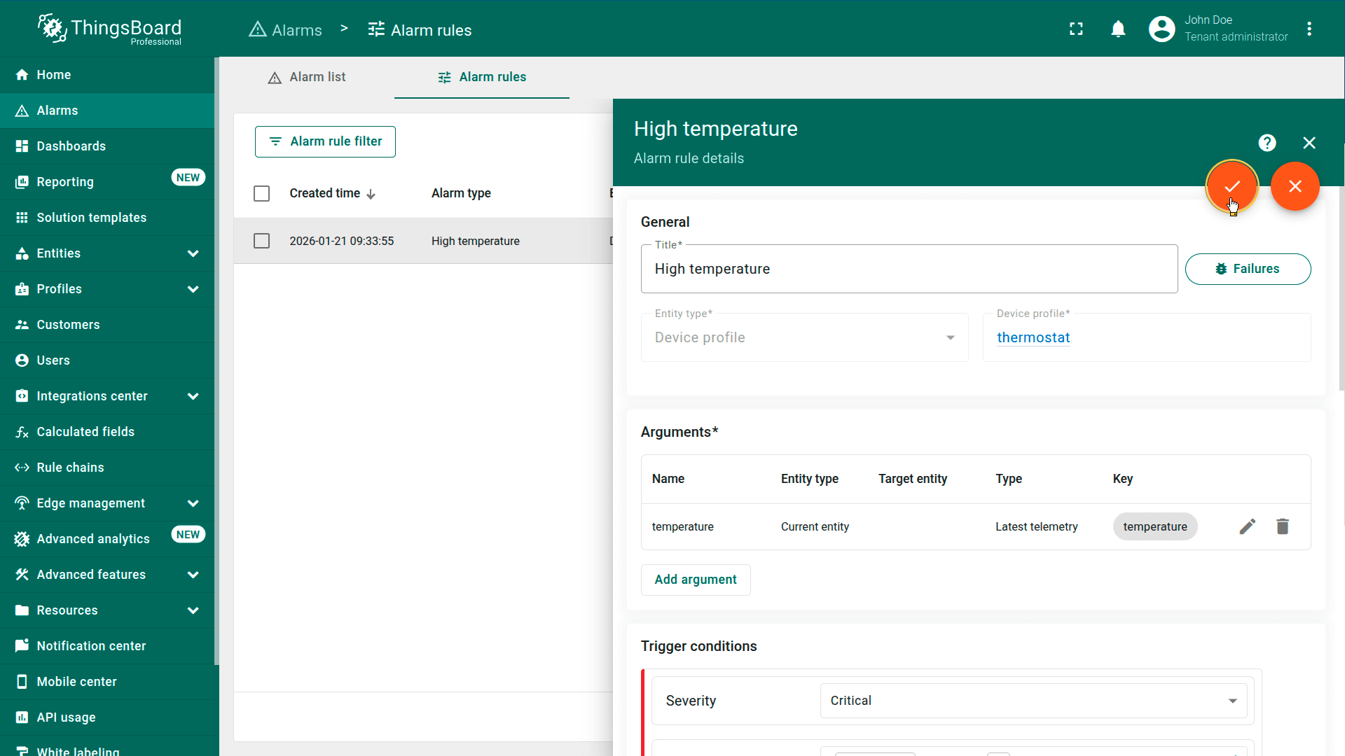 Note: The process of creating an alarm rule is the same for Devices, Assets, Device profiles, Asset profiles, and Customers.