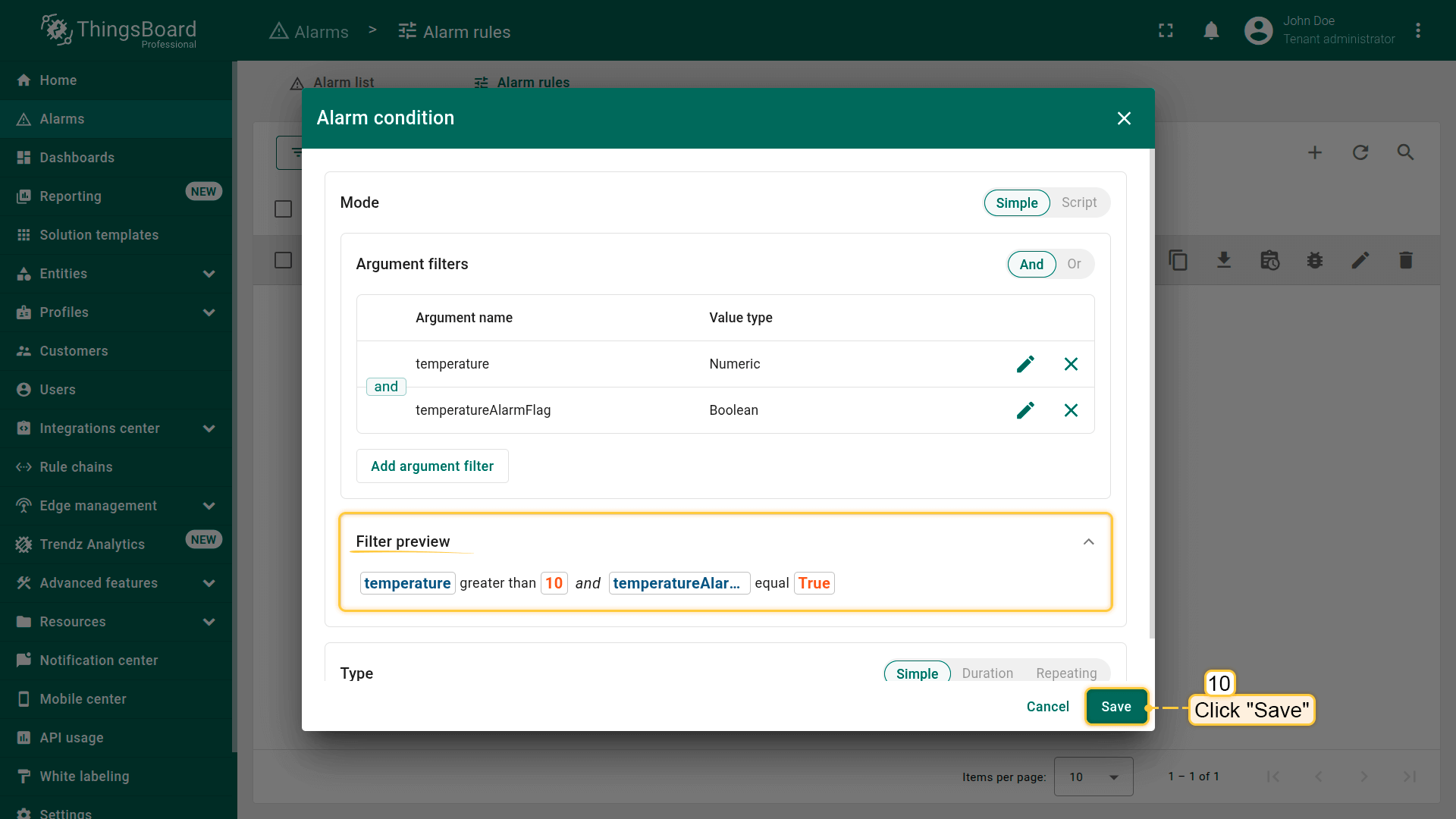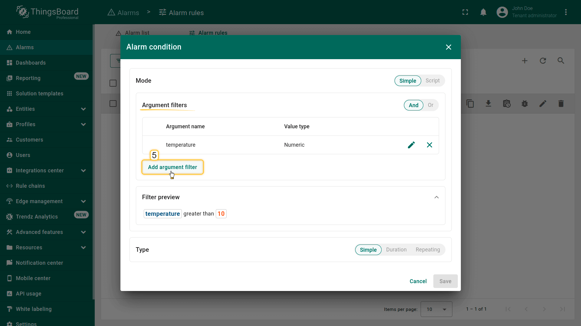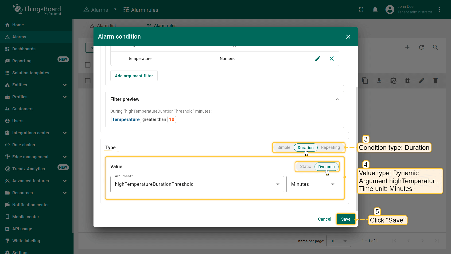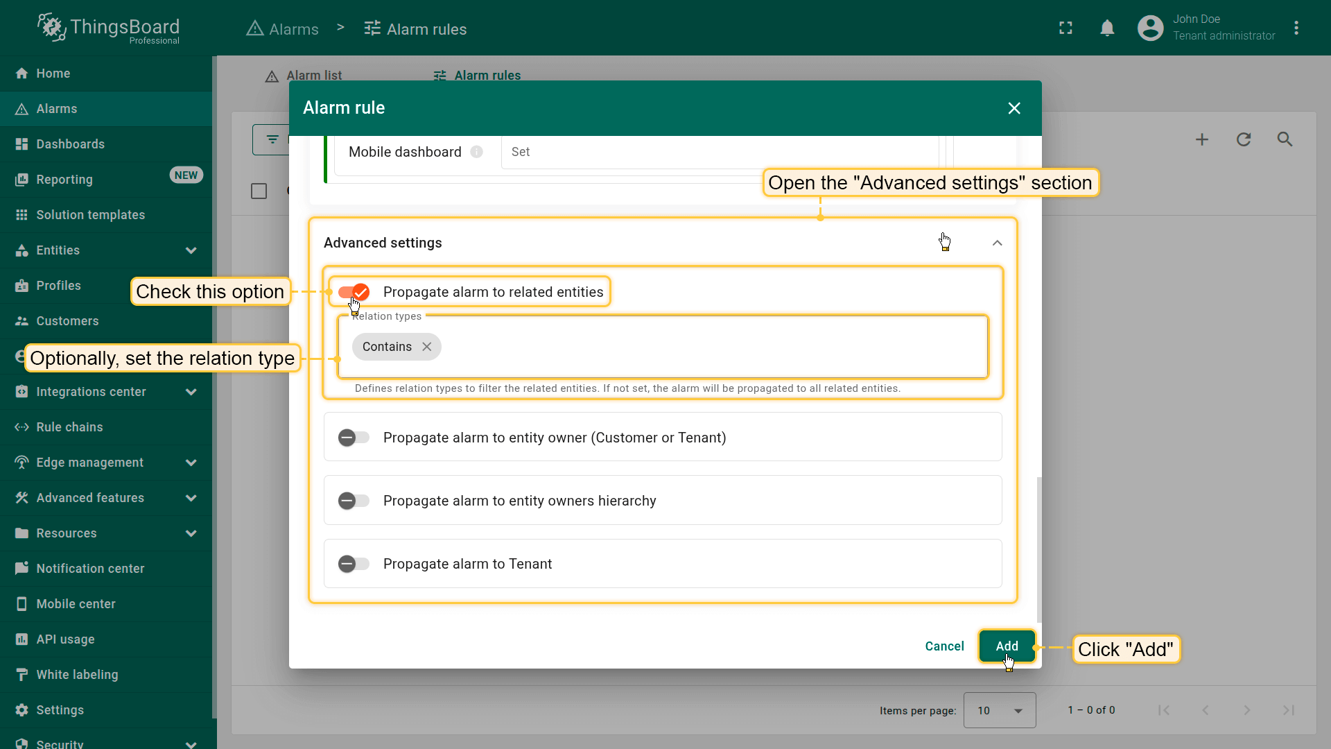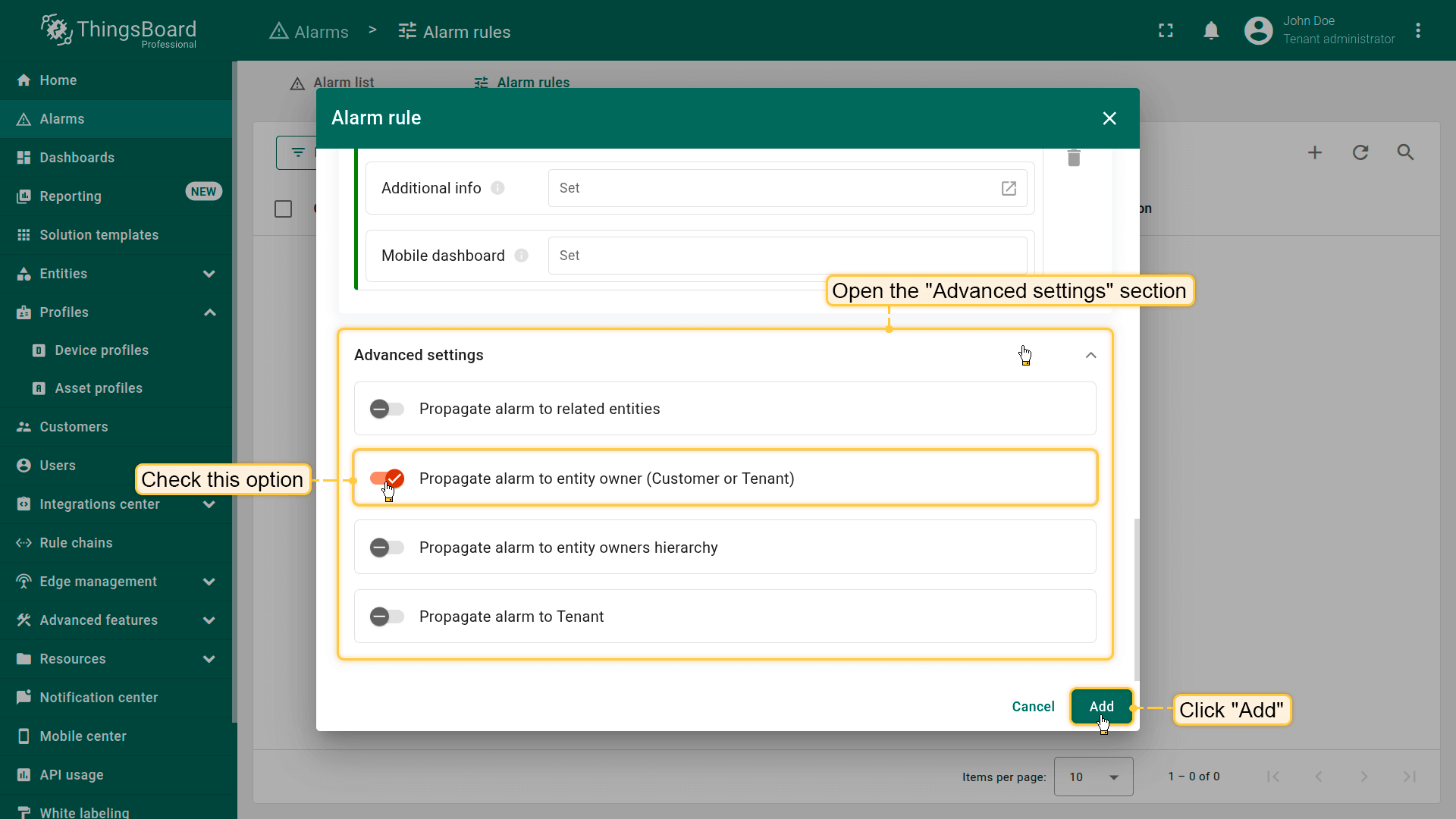 Note: The process of creating an alarm rule is the same for Devices, Assets, Device profiles, Asset profiles, and Customers.