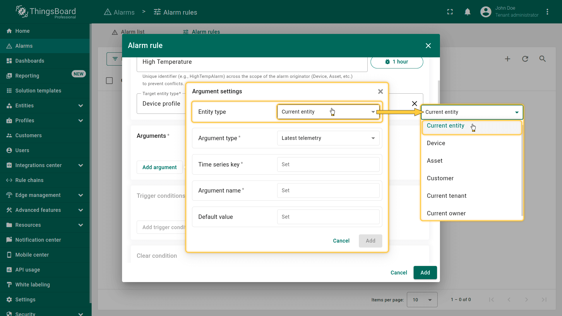 - Current entity — the entity you are configuring (device, asset, customer, or profile).