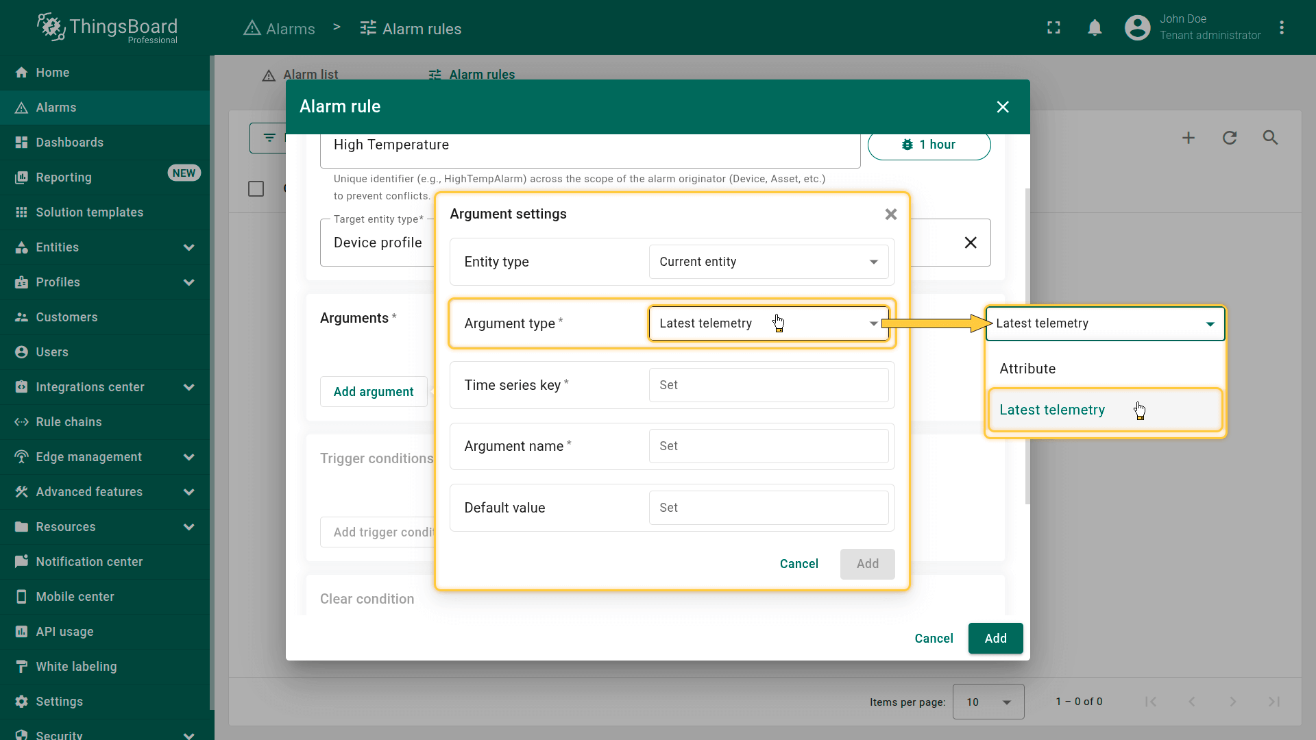 Before defining alarm conditions, you must add at least one argument — a data source that the rule will use during evaluation.