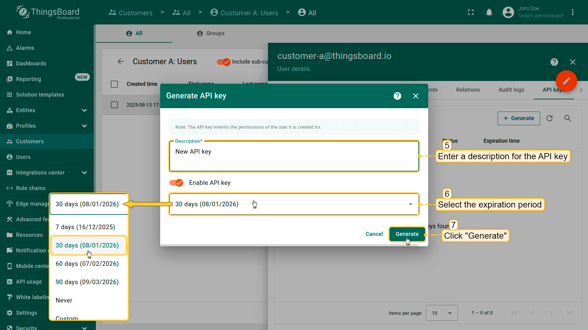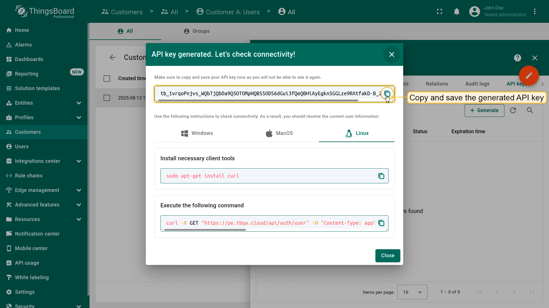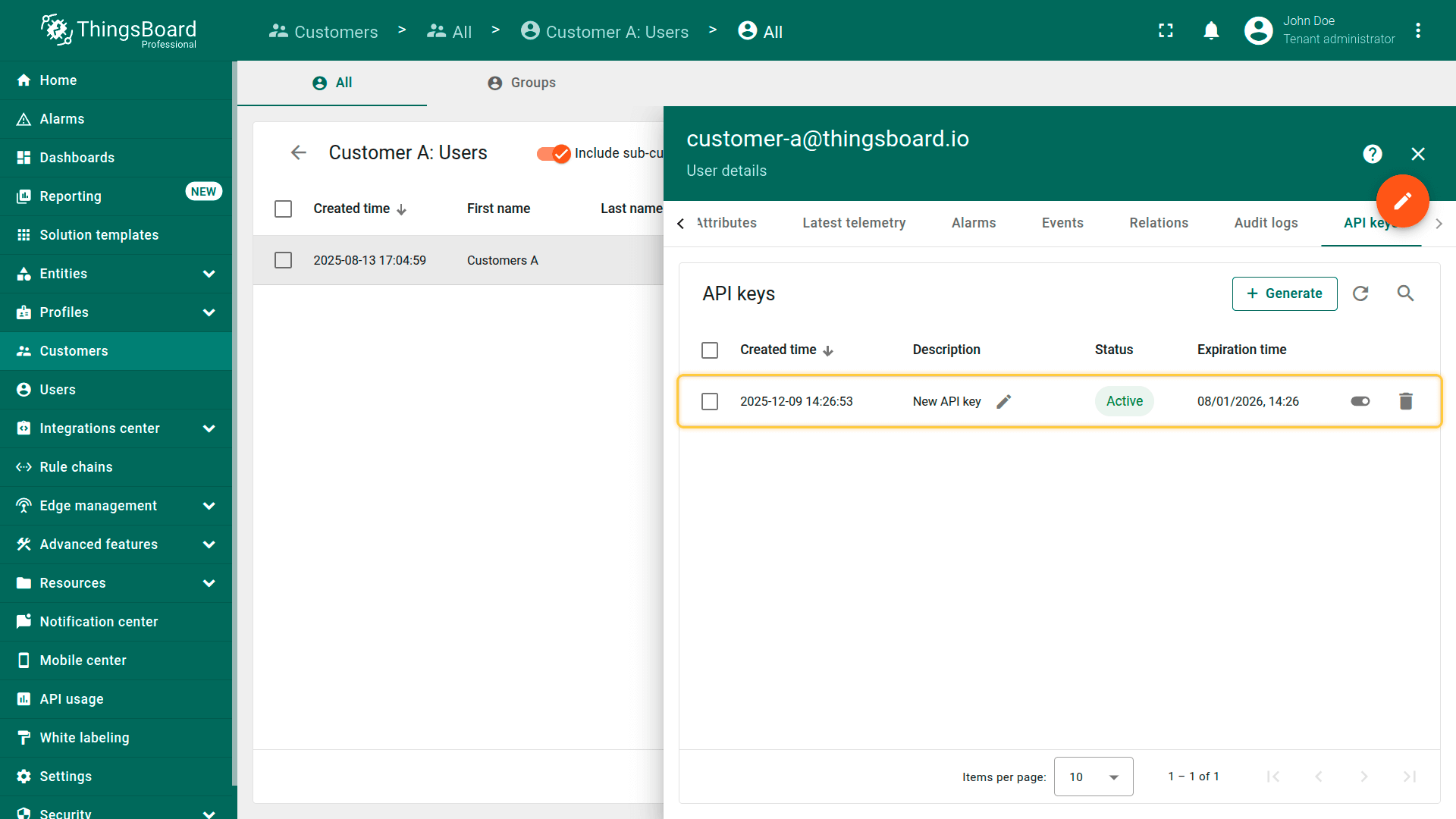API keys can also be created directly from the user’s details page. A system administrator can create API keys for any users available to them (tenant users), and a tenant administrator can create API keys for their customer users. In the user details view, the API keys tab provides full access to API key management for that specific user.