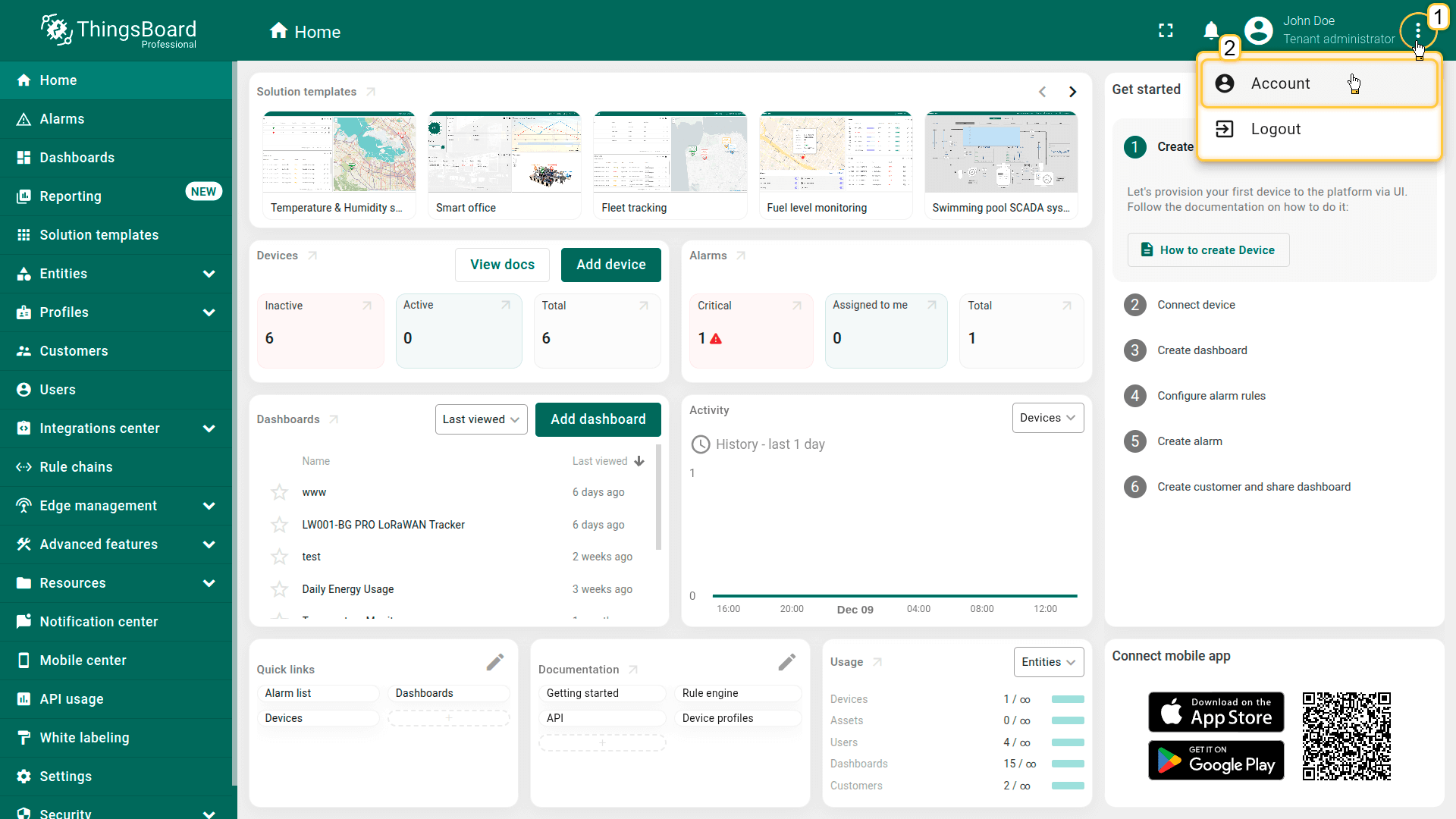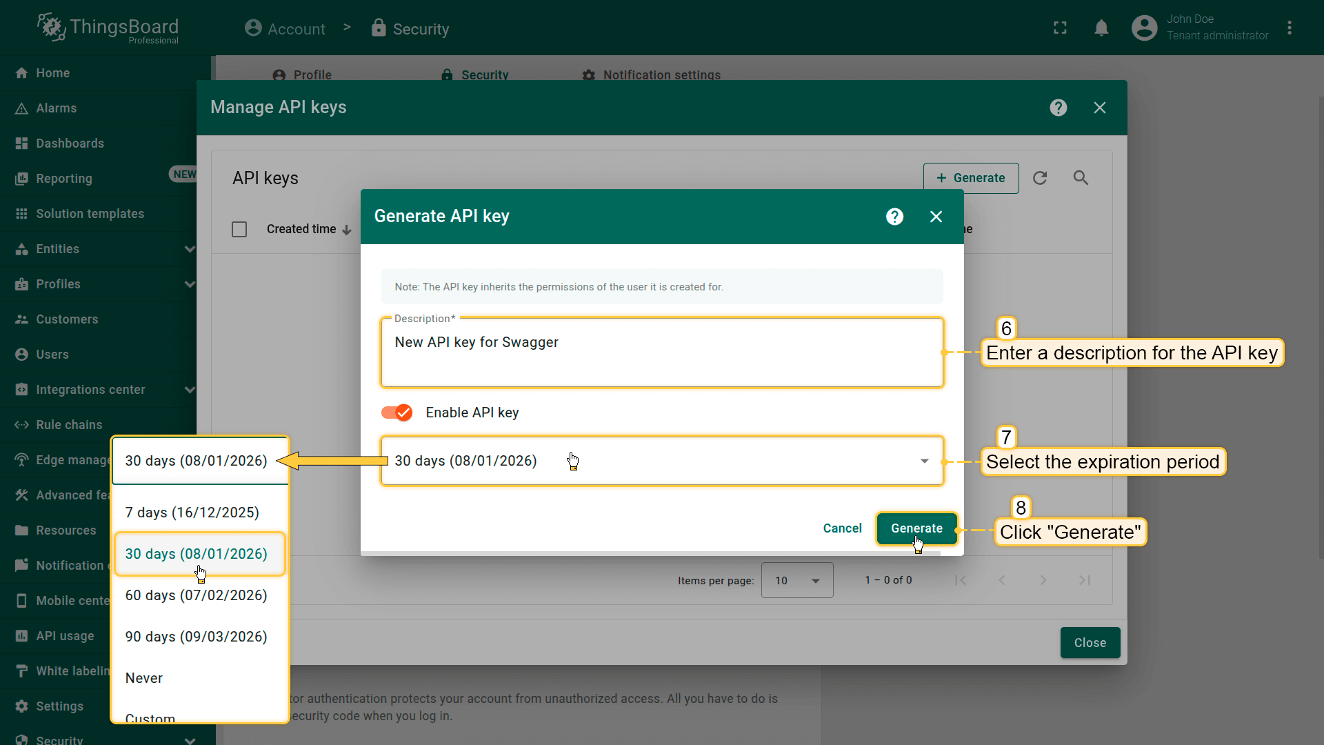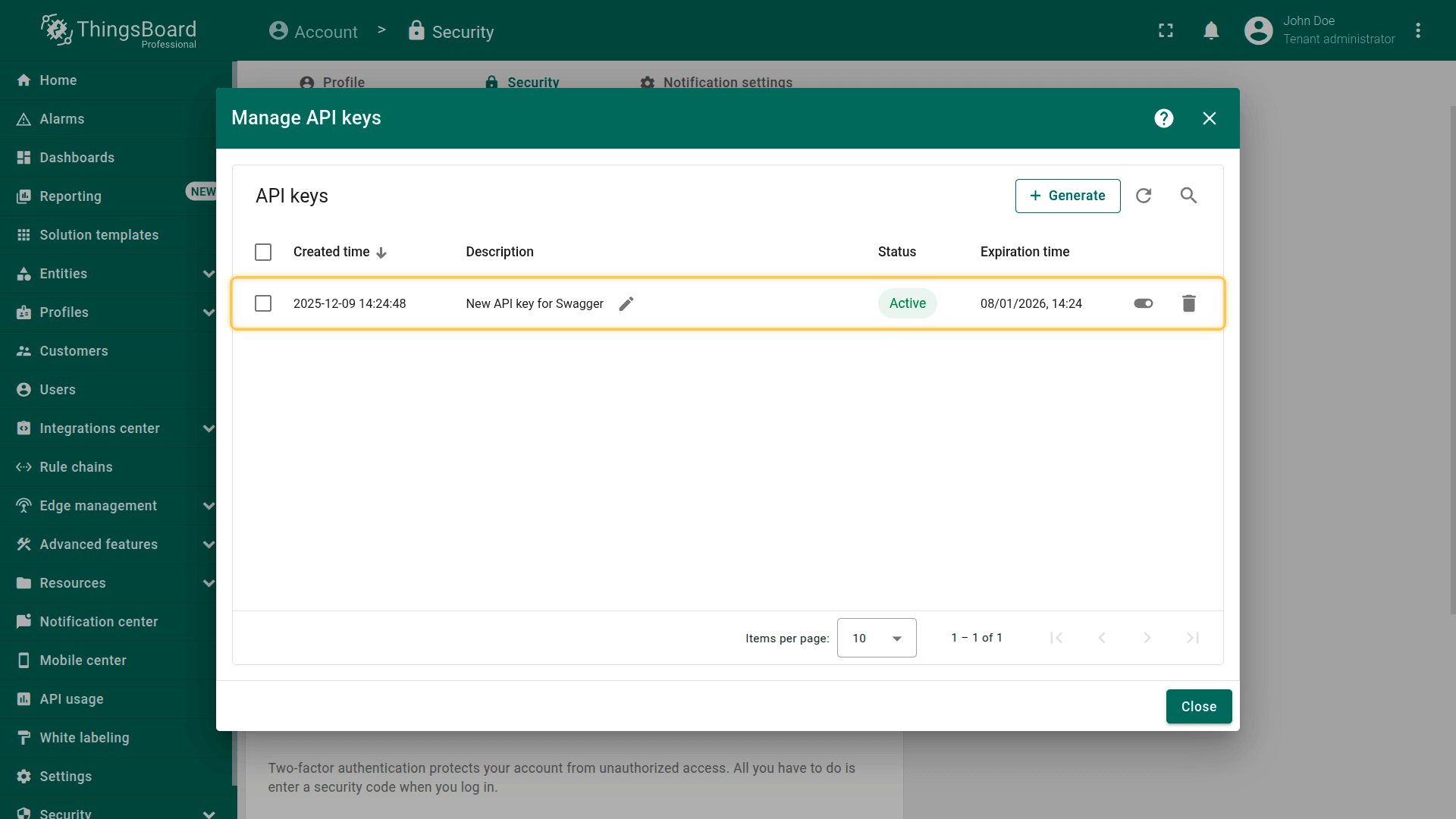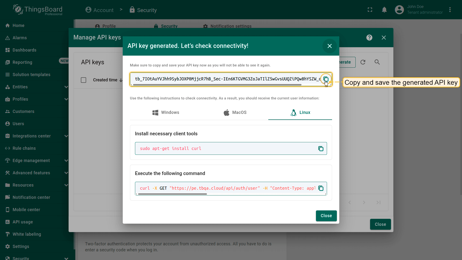 API keys provide a simpler alternative to password-based authentication for the ThingsBoard API.