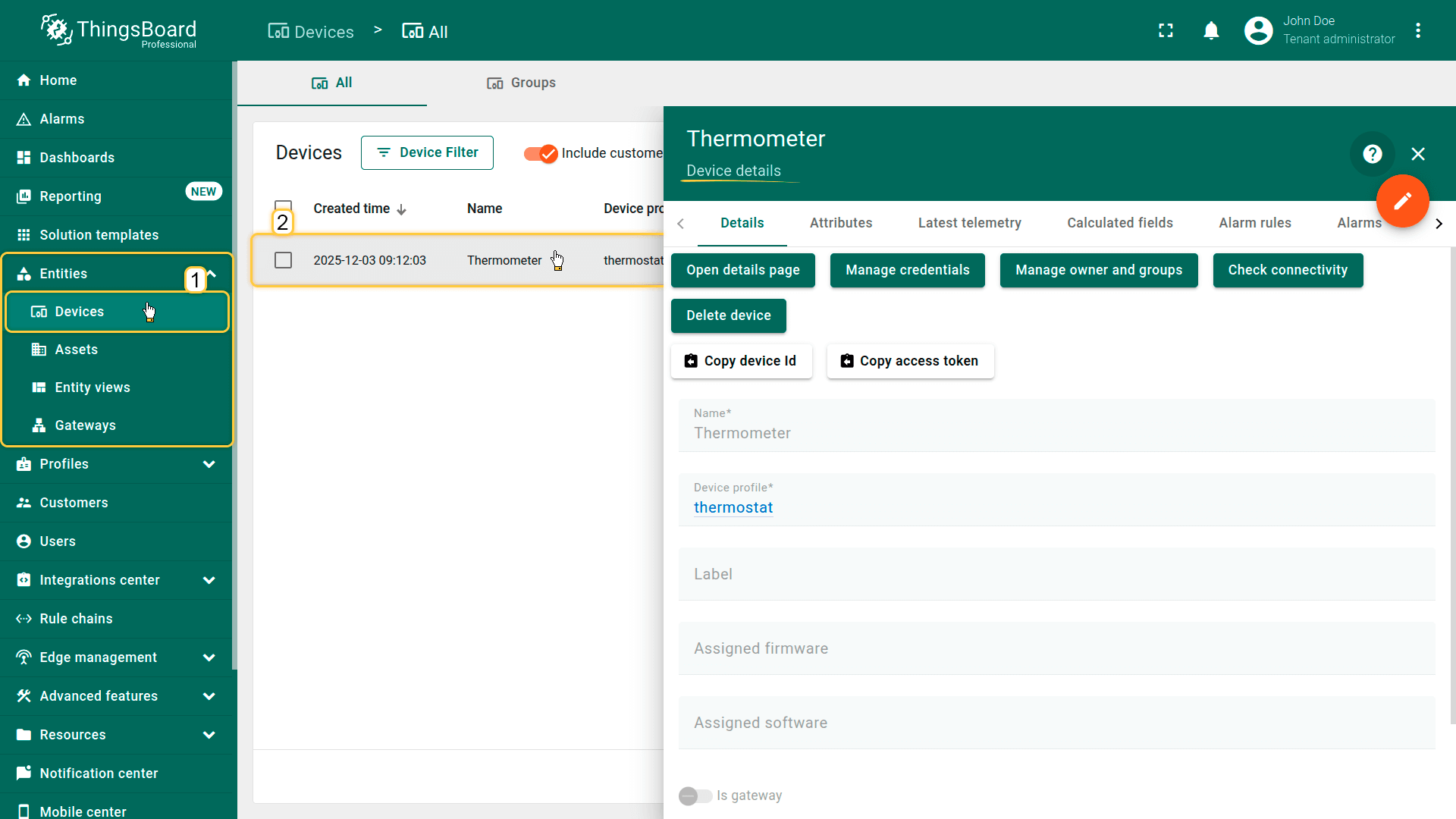 Tenant administrators and users with appropriate permissions can create, edit, or delete devices in ThingsBoard.