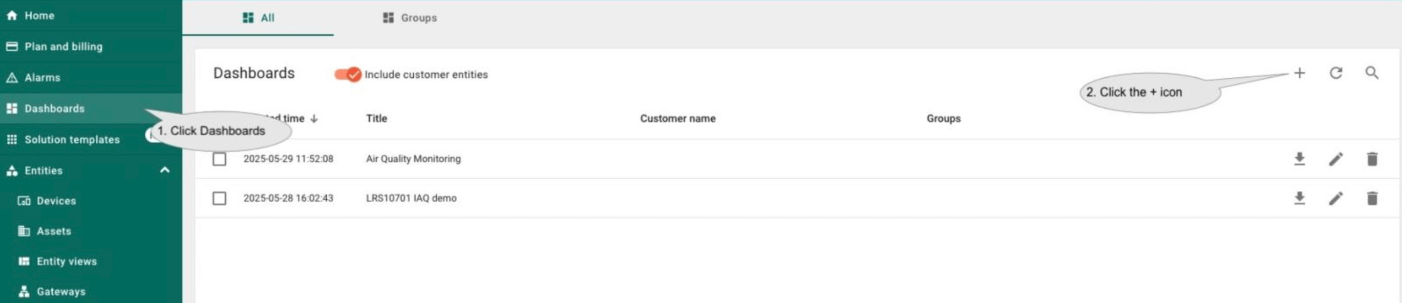 • Go to the “Dashboards” page, click the + button in the upper right corner of the page.