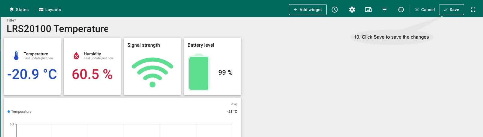 • Repeat the previous steps for other widgets. Lastly, click Save to store the changes and the dashboard is then ready for monitoring the new device.