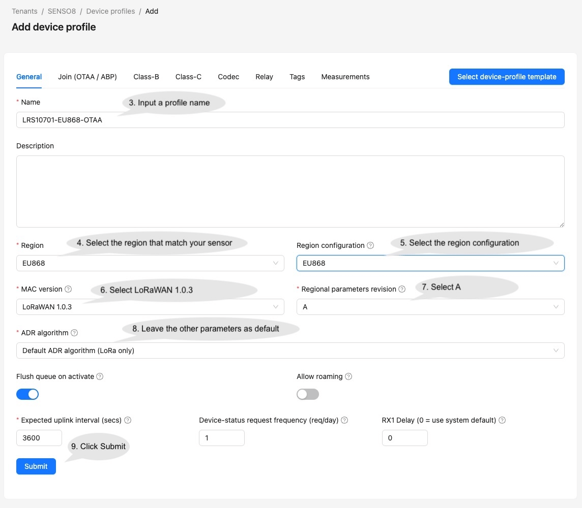 • Input the parameters on the Device Profile page and click Save. For Profile name, input ‘LRS10701-OTAA’ or ‘LRS10701-ABP’ depending on the sensor activation mode configured. It will be used on the data converter to determine the sensor model.