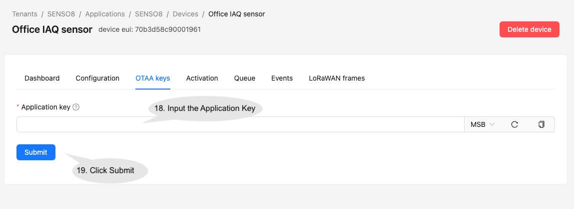 • It will then jump to the OTAA keys page. Input the Application Key of the sensor and click Submit.