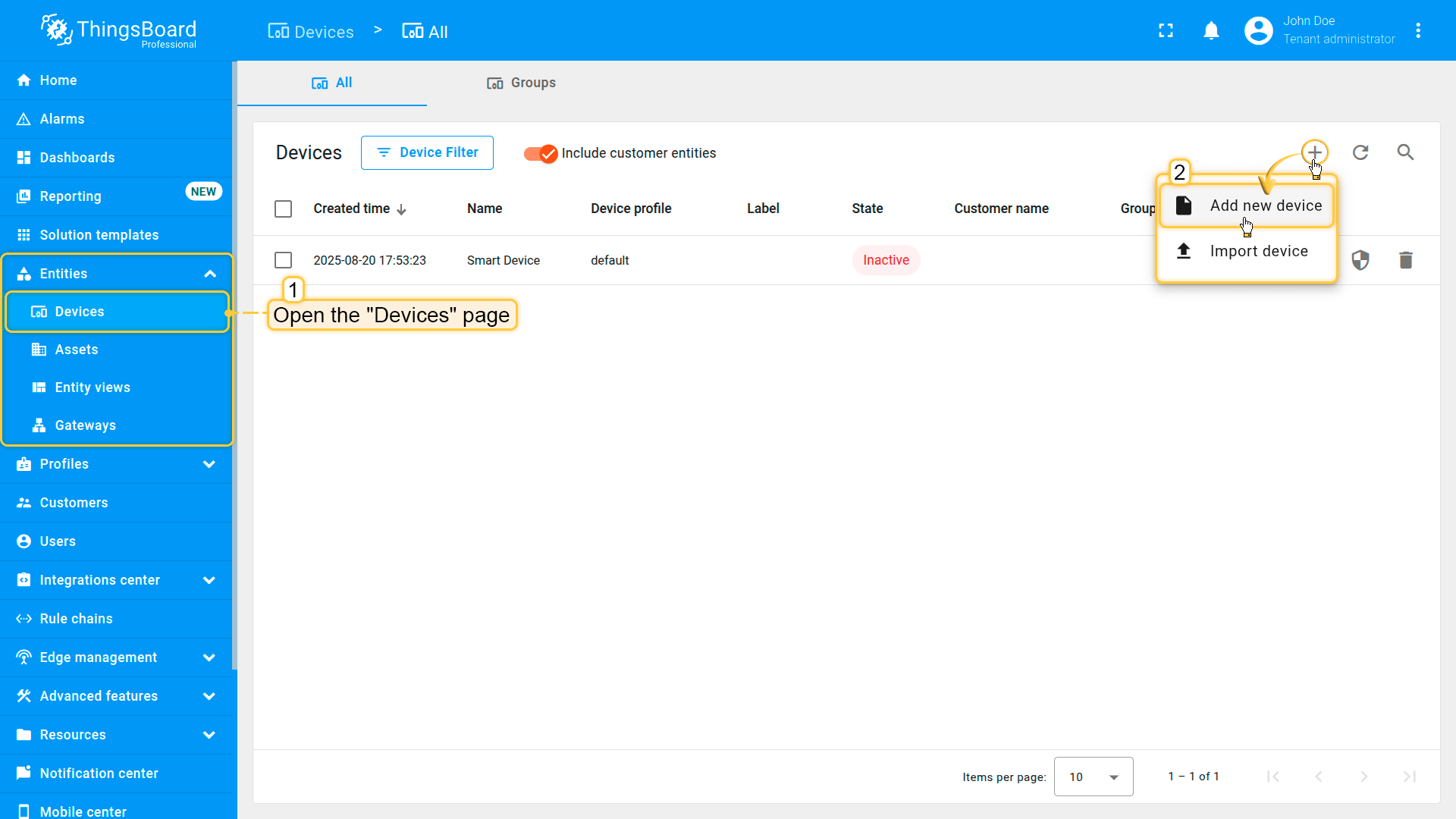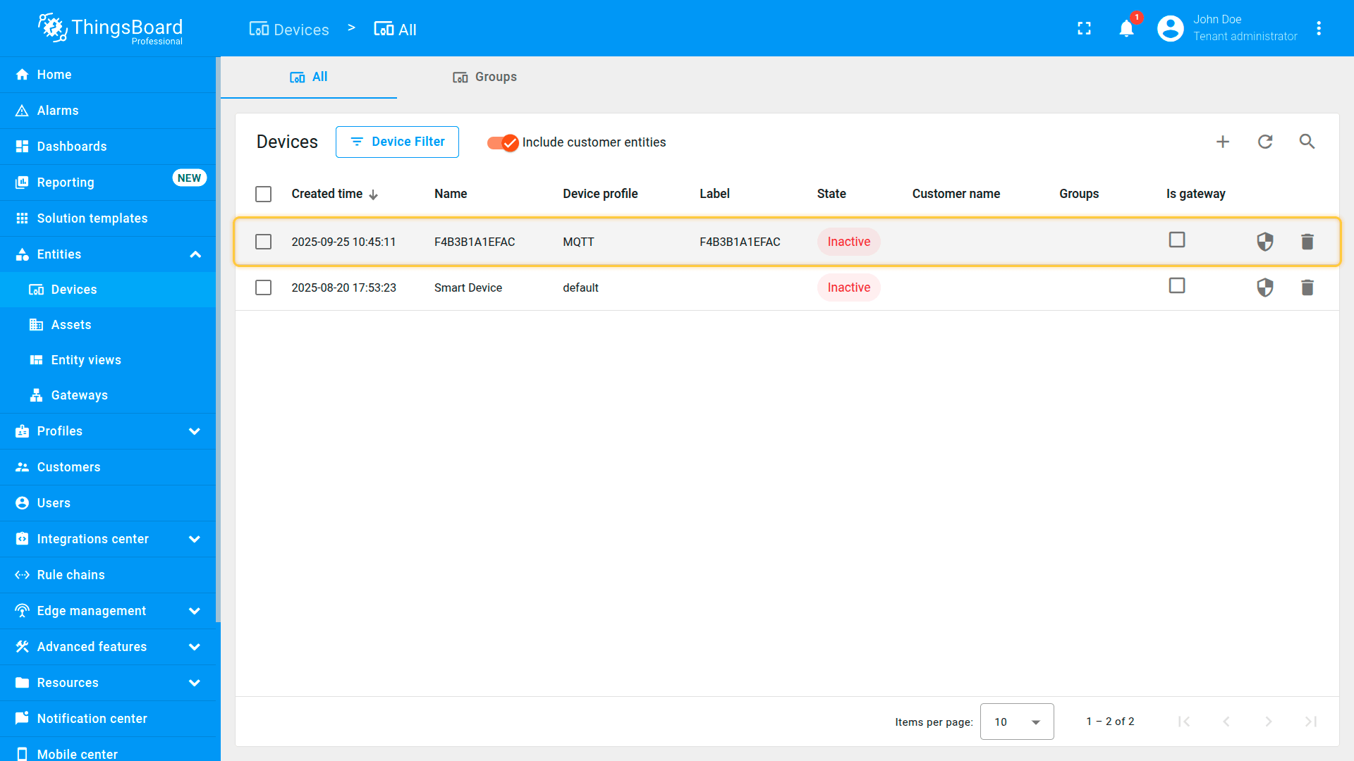 • In ThingsBoard, navigate to the “Devices” section and select your VIBit-BP device.