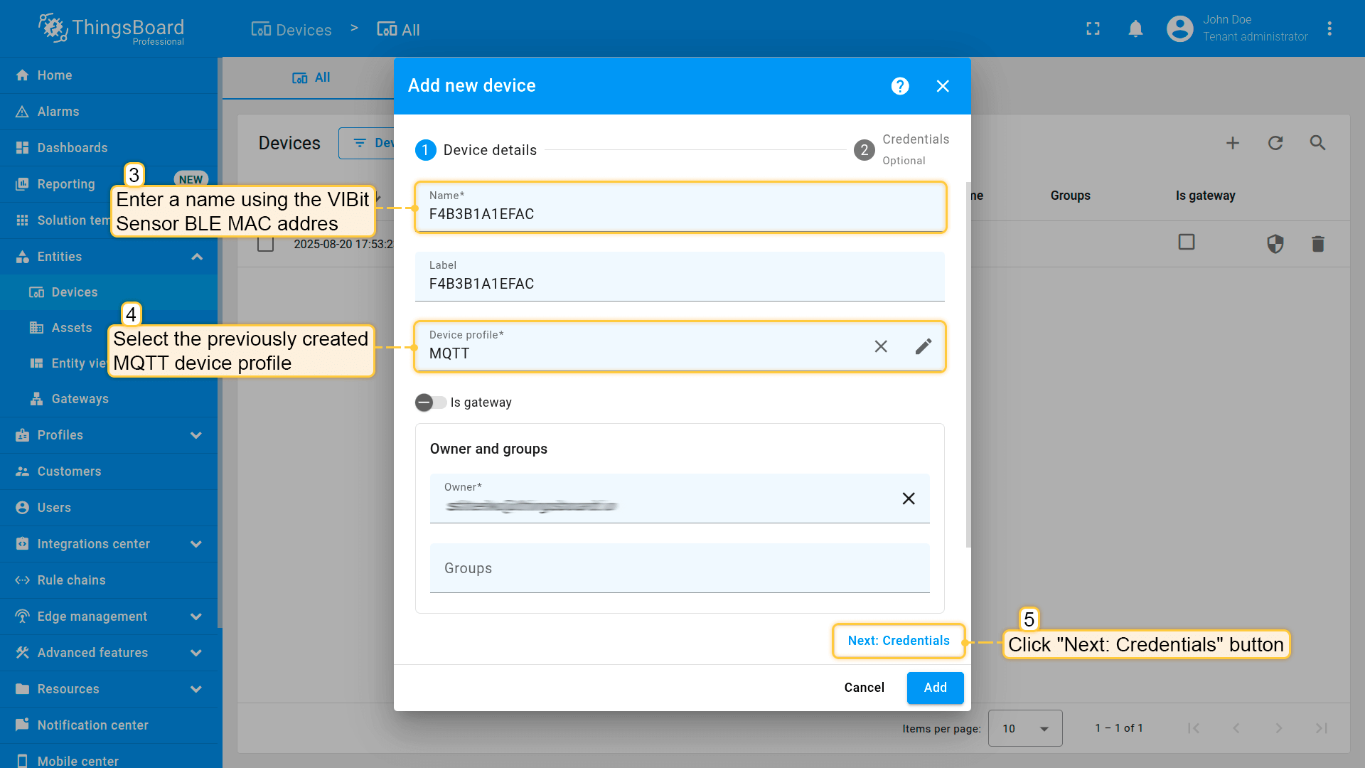 • Select the previously created MQTT device profile in the “Device profile” field.
