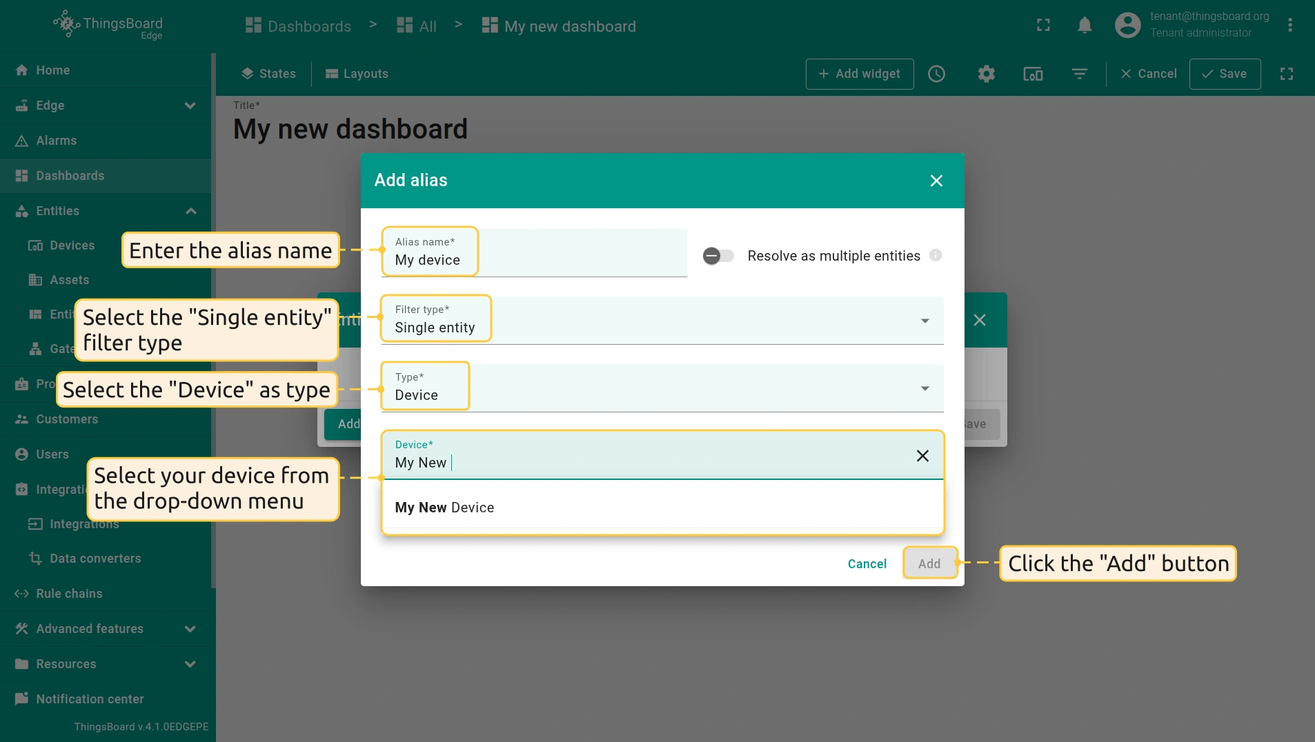 Log in to your ThingsBoard Edge instance and go to the Entities > Devices section. Click the “+” button in the top-right corner and select Add new device.