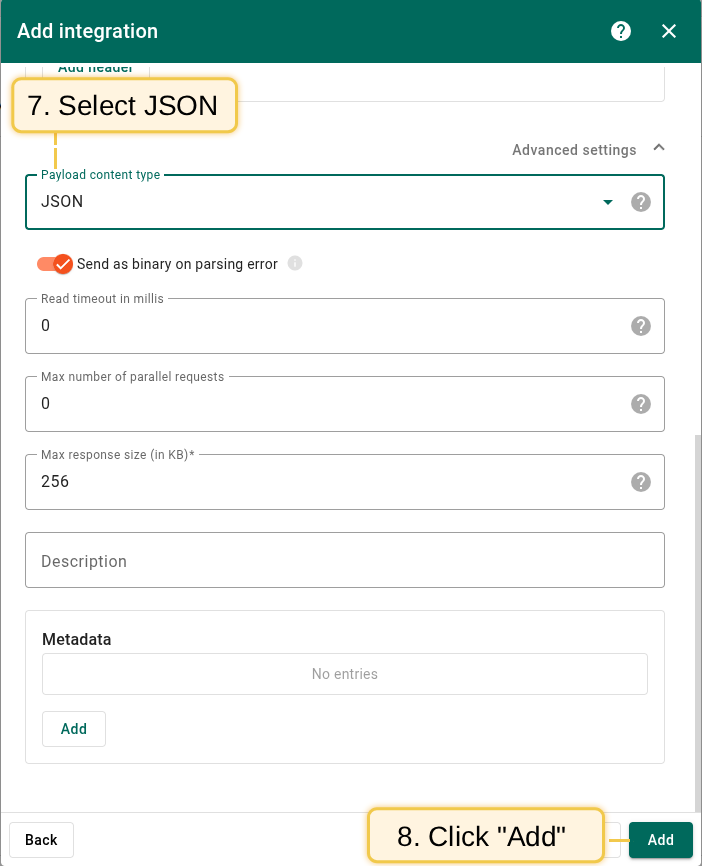 JSON. - Click Add to save the integration.