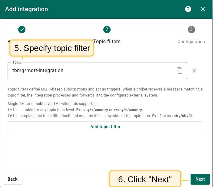 3. On the Topic Filters subscribe to the topic tbmq/mqtt-integration and click Next.