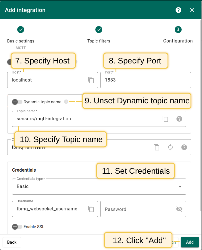 • Set ‘Credentials’ type to Basic and ‘Username’ to tbmq_websockets_username;