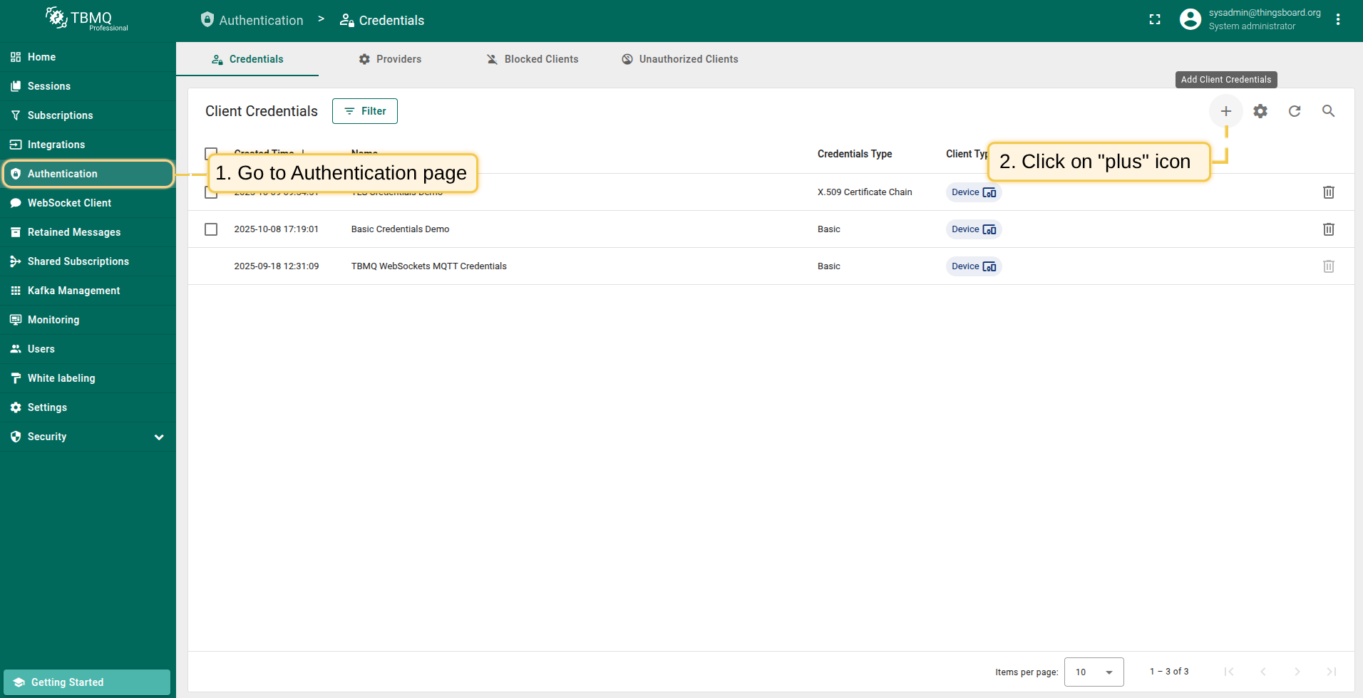 First, we need to create TBMQ client credentials to use them for connecting ThingsBoard integration to TBMQ.