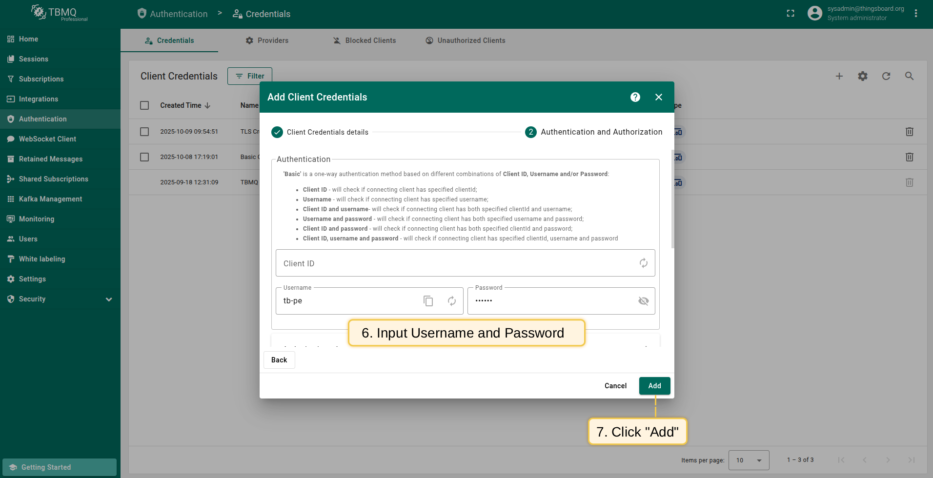 • Input "Username" and "Password" with chosen values. For example, use `tb-pe` value for Username and `secret` for Password fields. Click "Add" to save credentials.