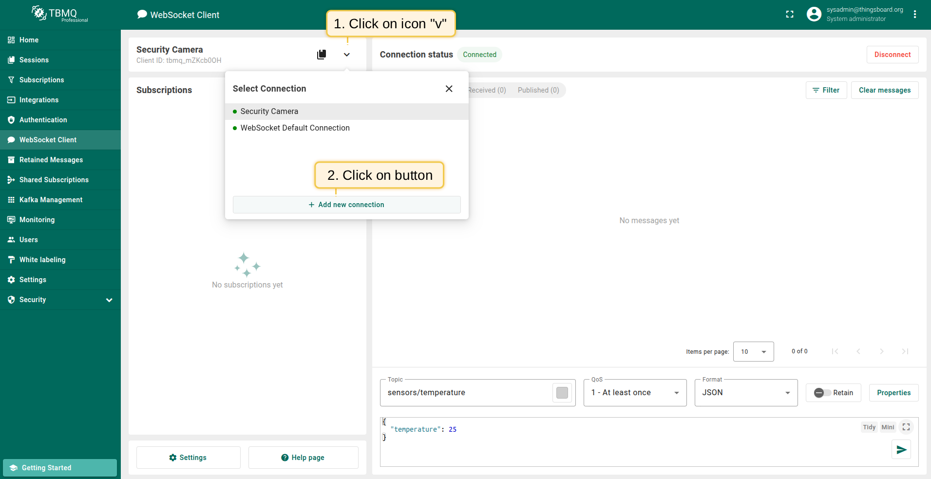 - Navigate to the WebSocket Client page and click on Select Connection icon.