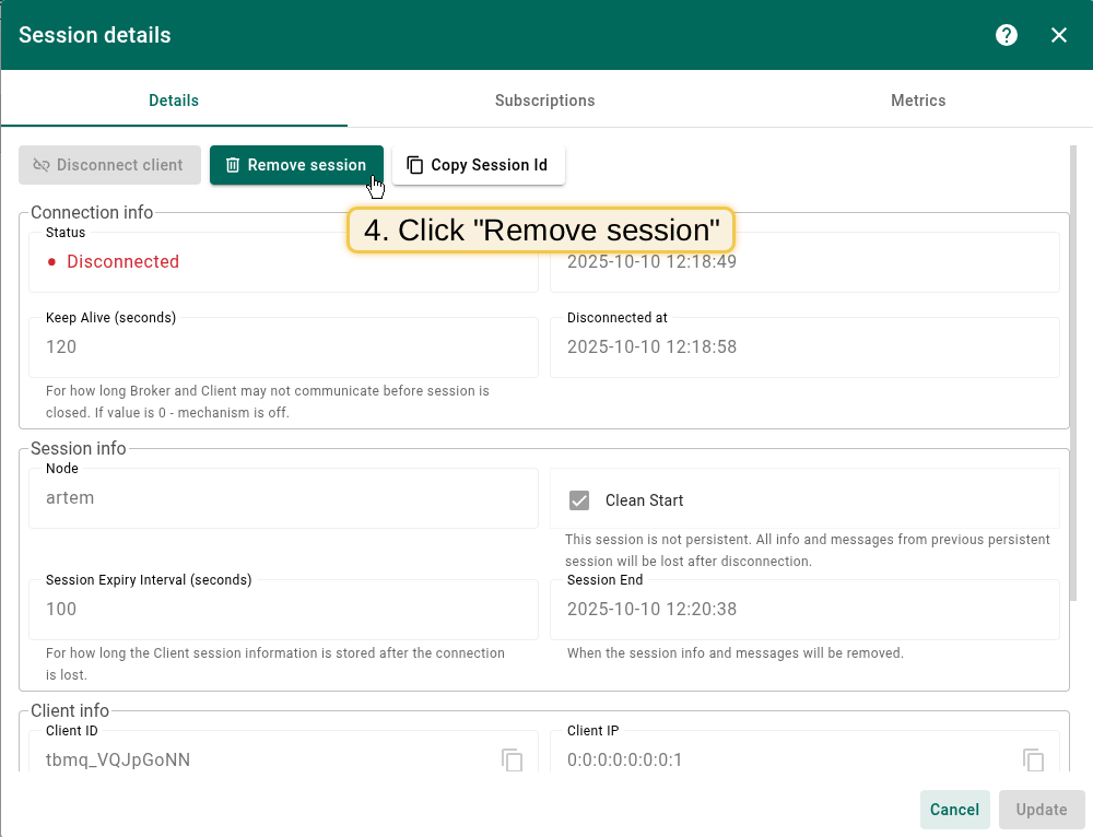• Session end - for persistent disconnected clients, when the session info and messages will be removed.