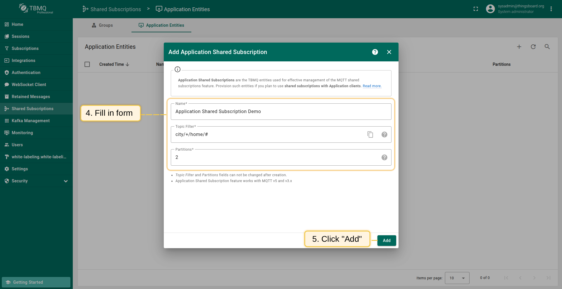 • Add Application shared subscriptions if you plan to use shared subscriptions feature with Application clients.