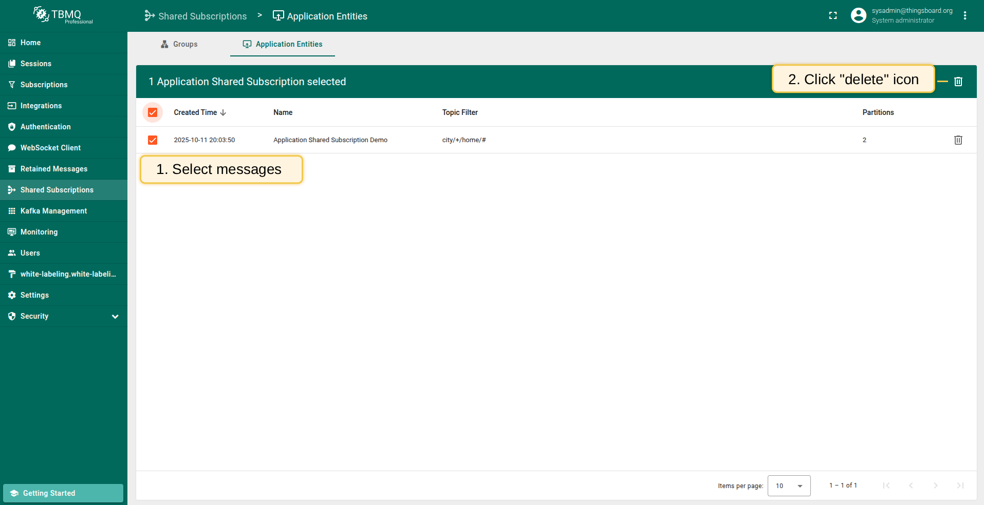 Broker administrators are able to manage shared subscriptions via Web UI or REST API.