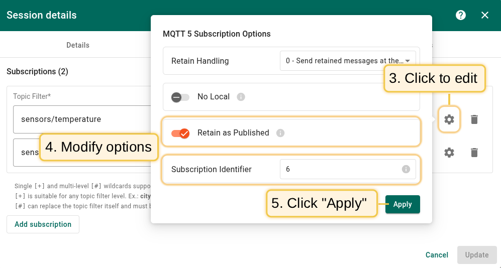 - Retain as Published. When true, messages forwarded using this subscription keep the RETAIN flag they were published with.
