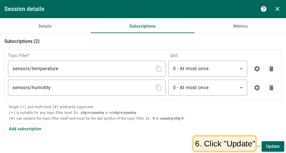 On the Subscriptions page you may observe, analyze or filter all subscriptions on the broker. The table contains the following information about each subscription: