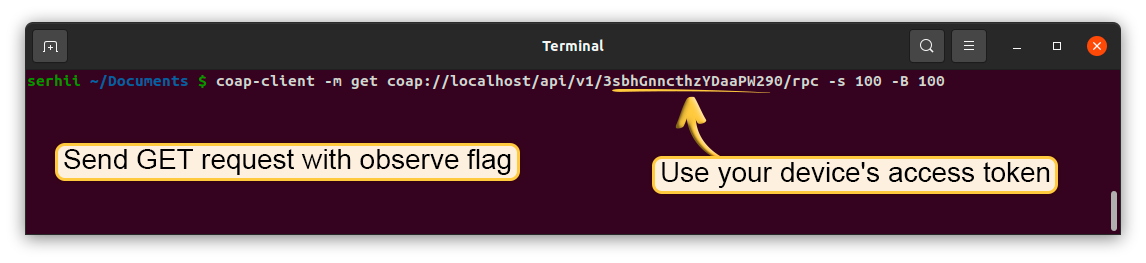 ThingsBoard server nodes act as a CoAP Server that supports both regular and observe requests.
