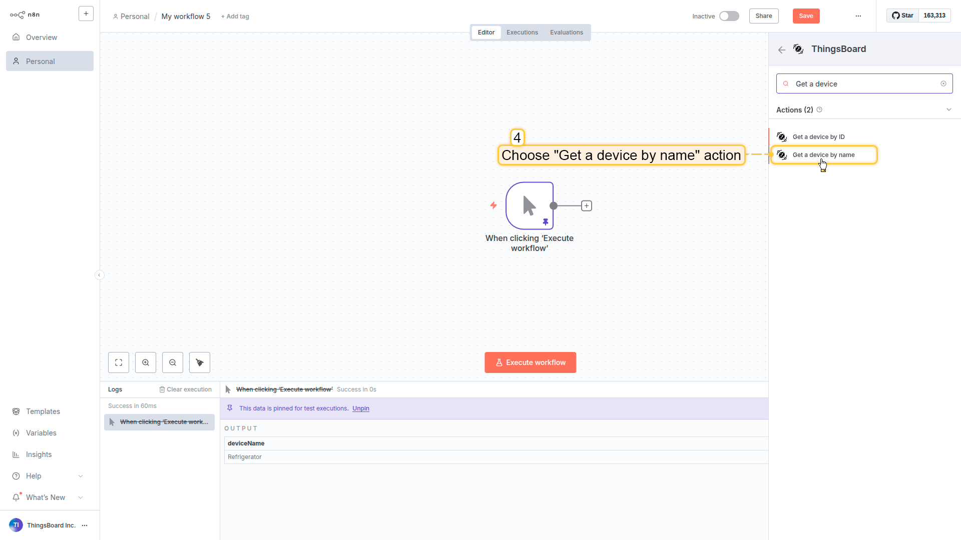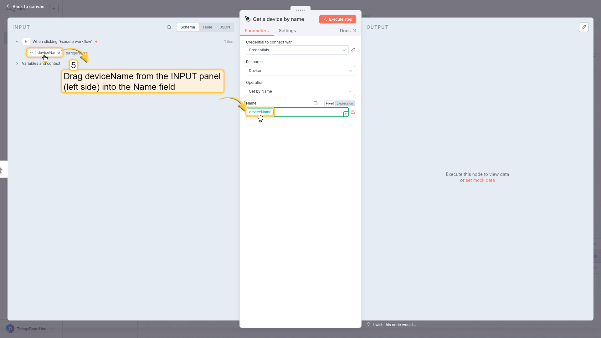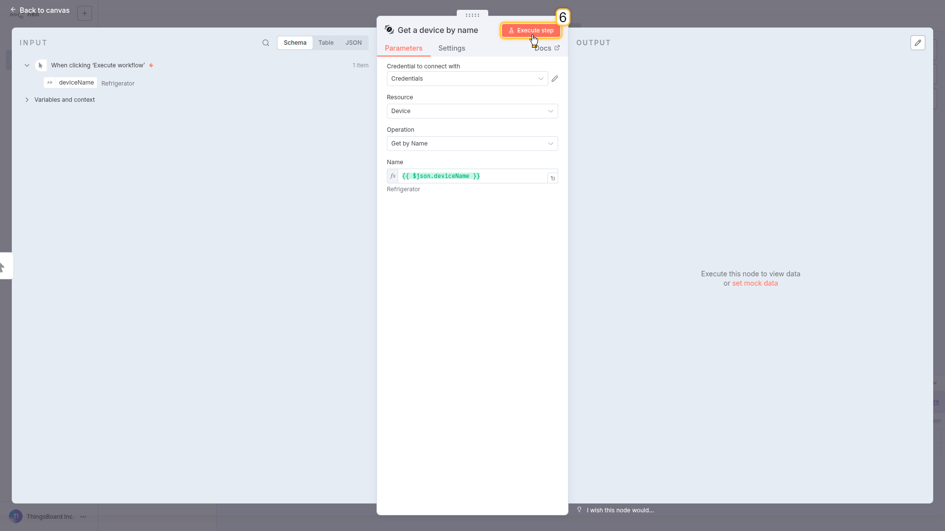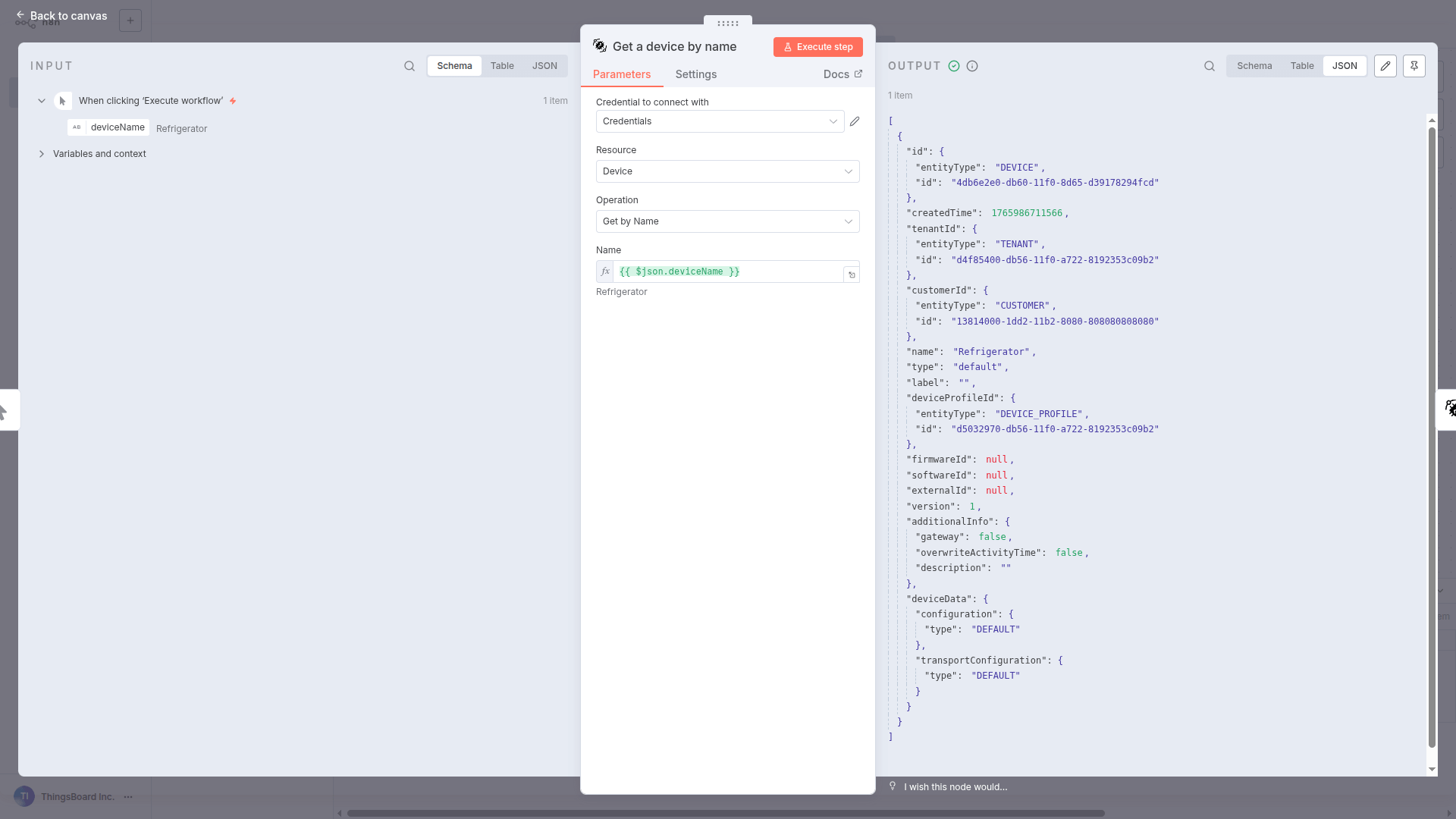 This step retrieves the device entity from ThingsBoard using the name provided by the trigger.
