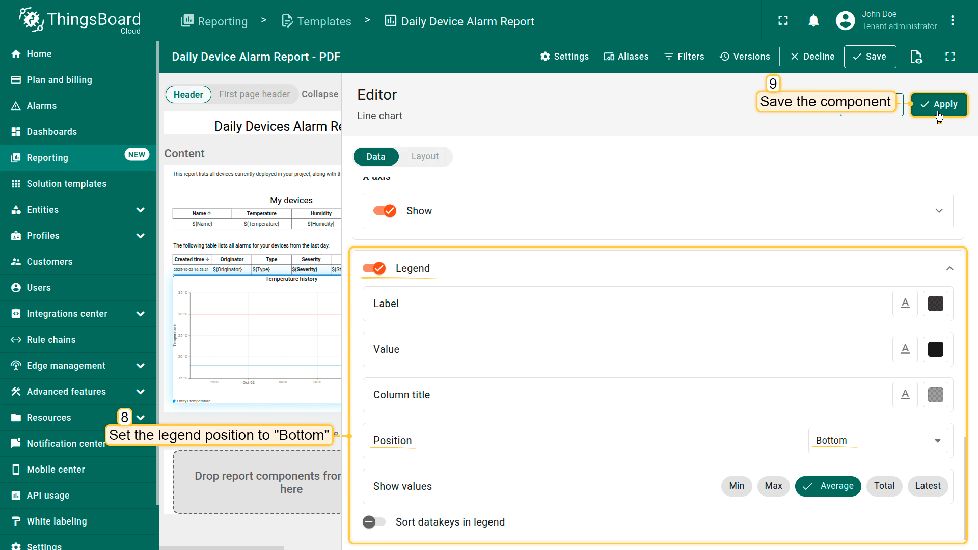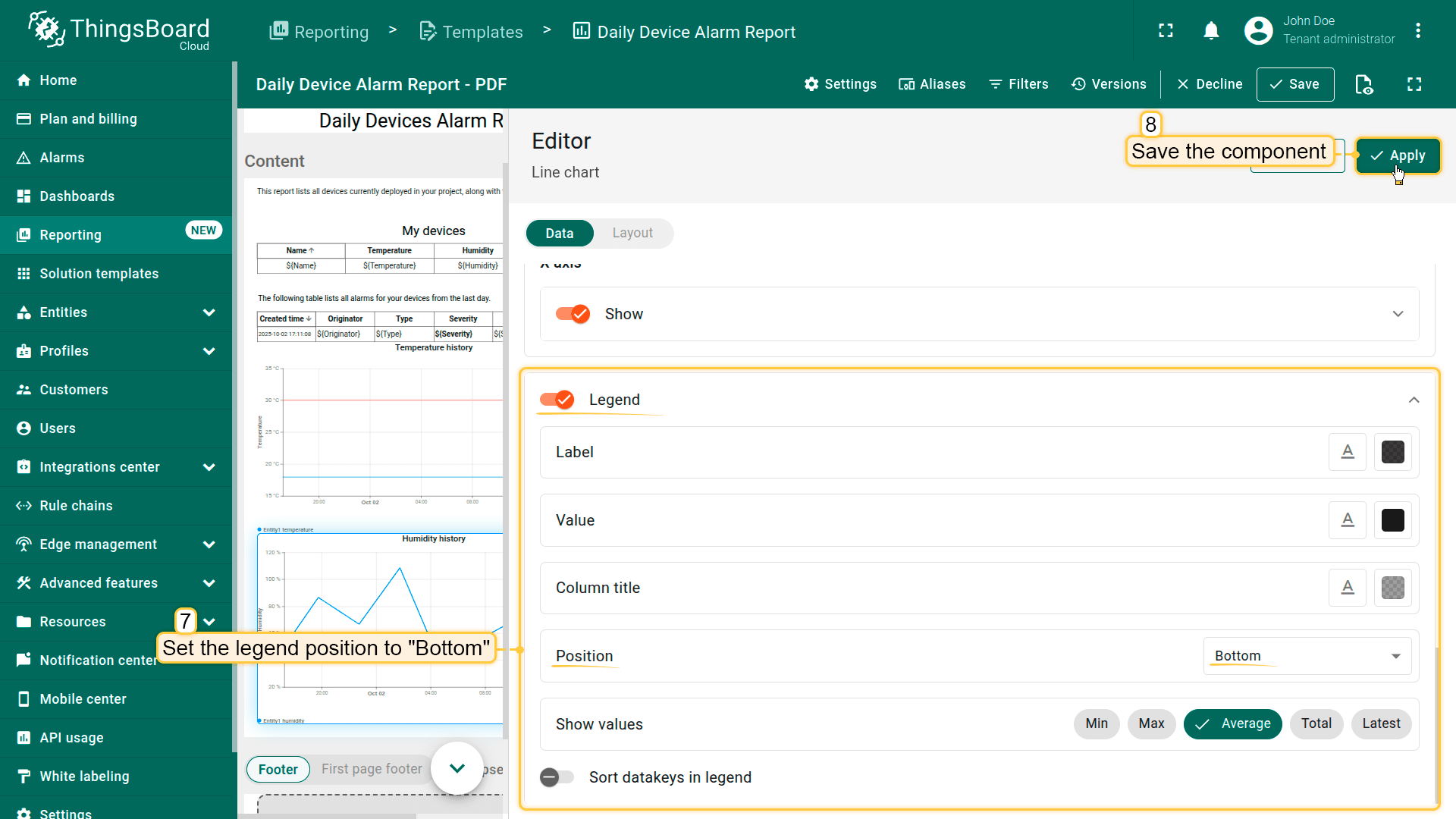 - Only Tenant Users can view generated reports directly in the ThingsBoard Web UI.